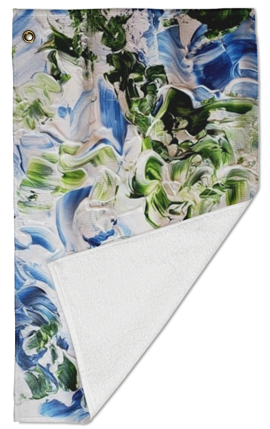 The towel is fully printed / patterned on the front polyester side; and is white on terrycloth cotton backside. The towel has grommet and a pear spring clip in the top left corner. Our golf towels are available in 100s of different prints and patterns.