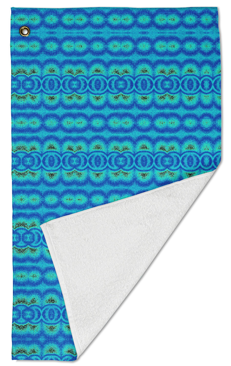 The towel is fully printed / patterned on the front polyester side; and is white on terrycloth cotton backside. The towel has grommet and a pear spring clip in the top left corner. Our golf towels are available in 100s of different prints and patterns.