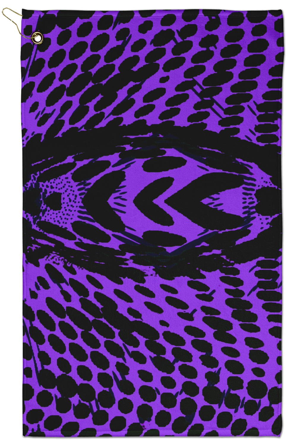 The towel is fully printed / patterned on the front polyester side; and is white on terrycloth cotton backside. The towel has grommet and a pear spring clip in the top left corner. Our golf towels are available in 100s of different prints and patterns.