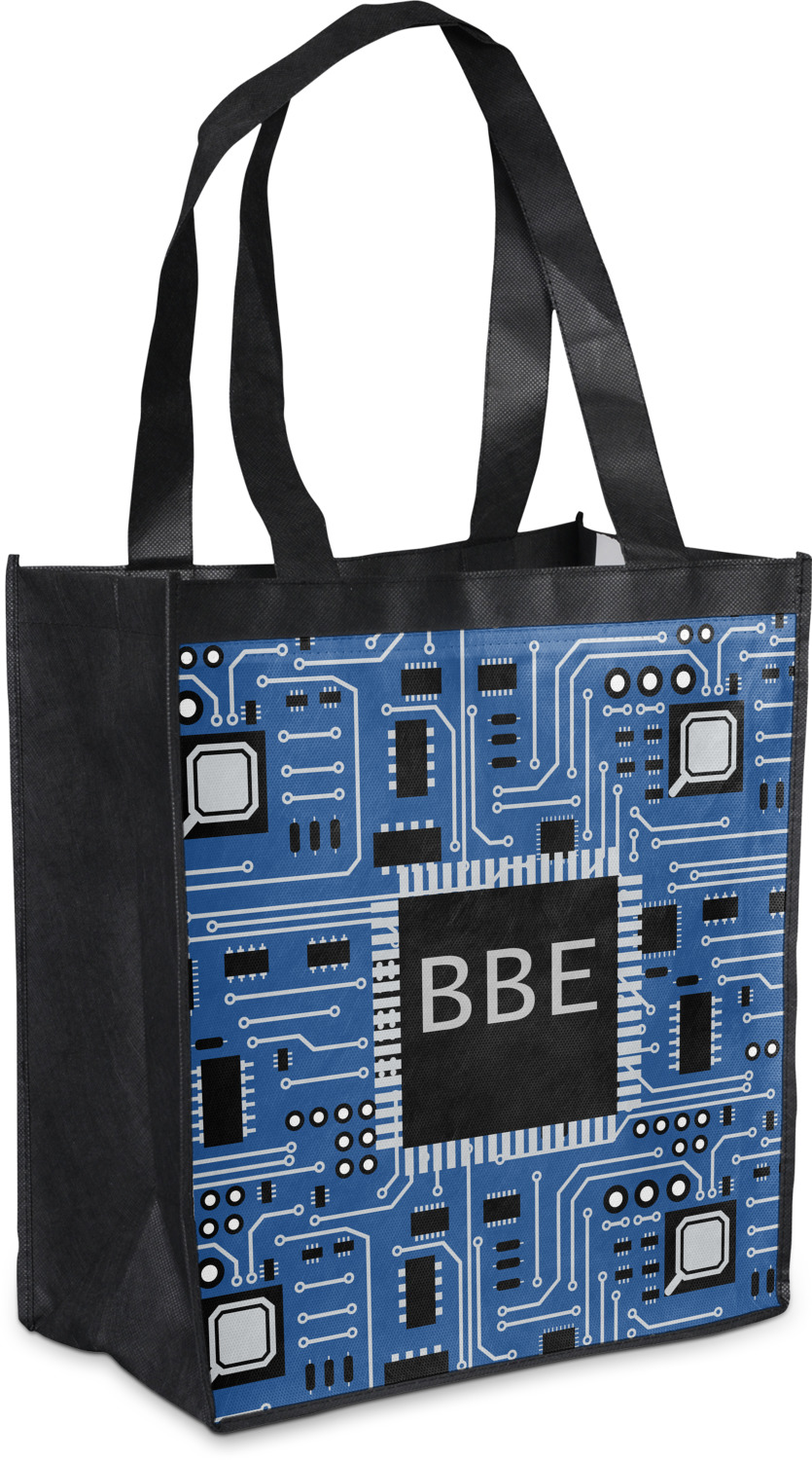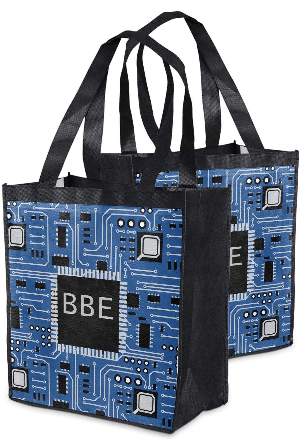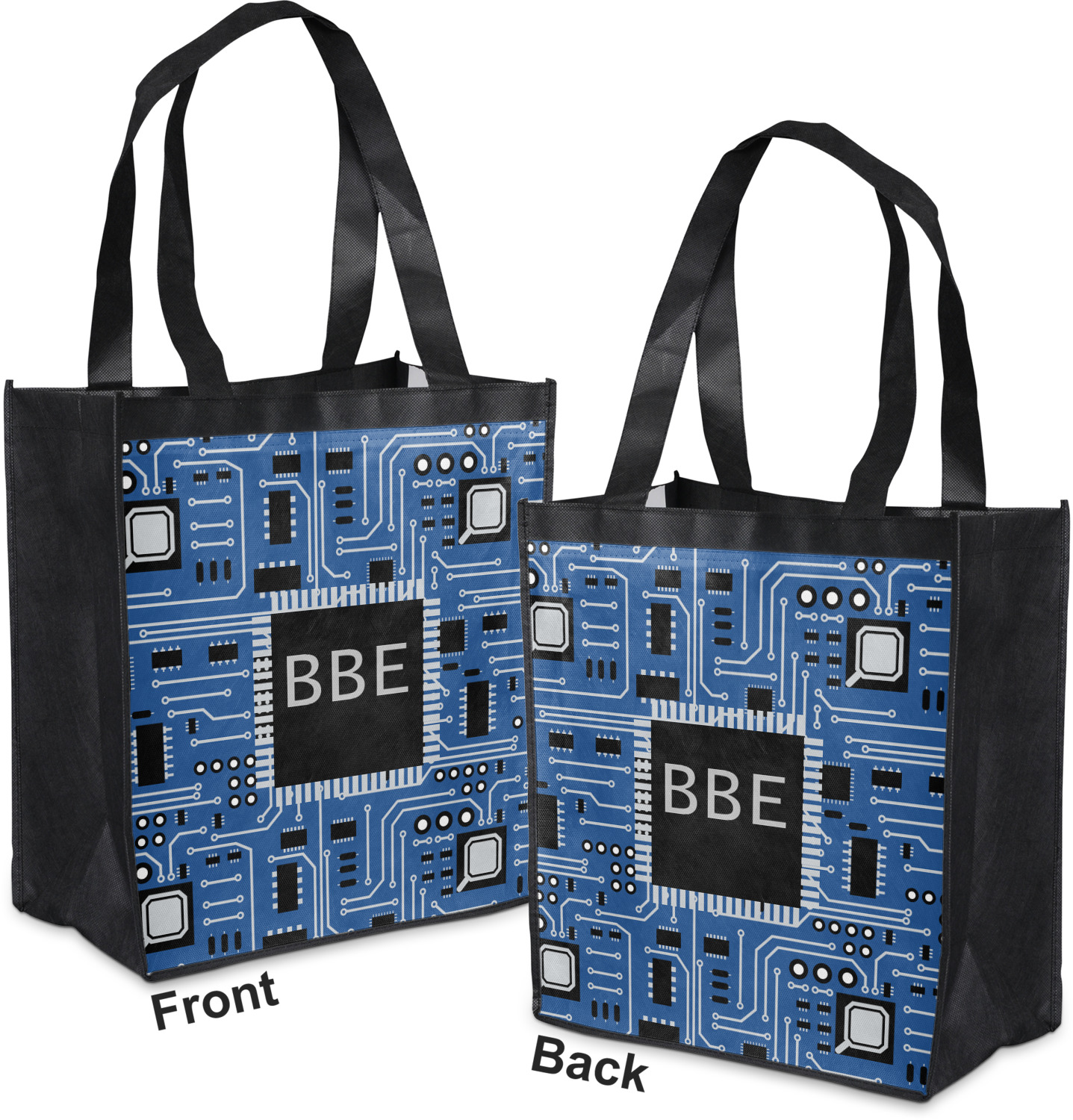 Made from a durable, biodegradable material, these reusable shopping bags can support up to 30 pounds of weight. With two large handles, measuring at 8.5 inches each, these personalized tote bags are easy to carry to your vehicle or home. The bag itself is 12 by 13.5 inches, and can expand to a depth of 7 inches. Your customization is printed on both the front and back, while the remaining sides, trim, and handle are a sleek, charcoal black.