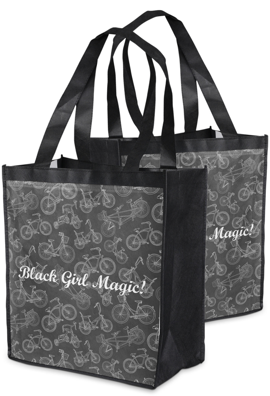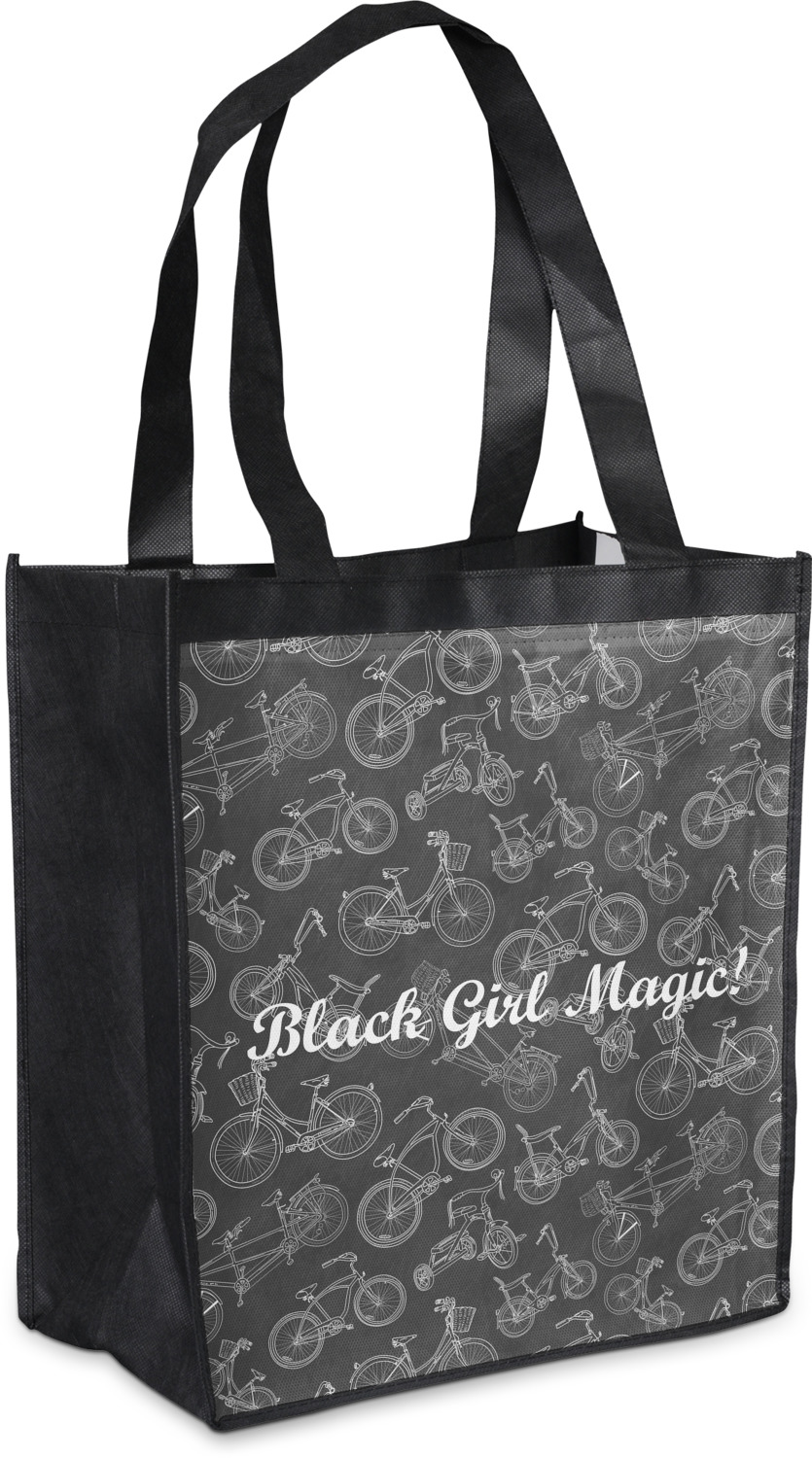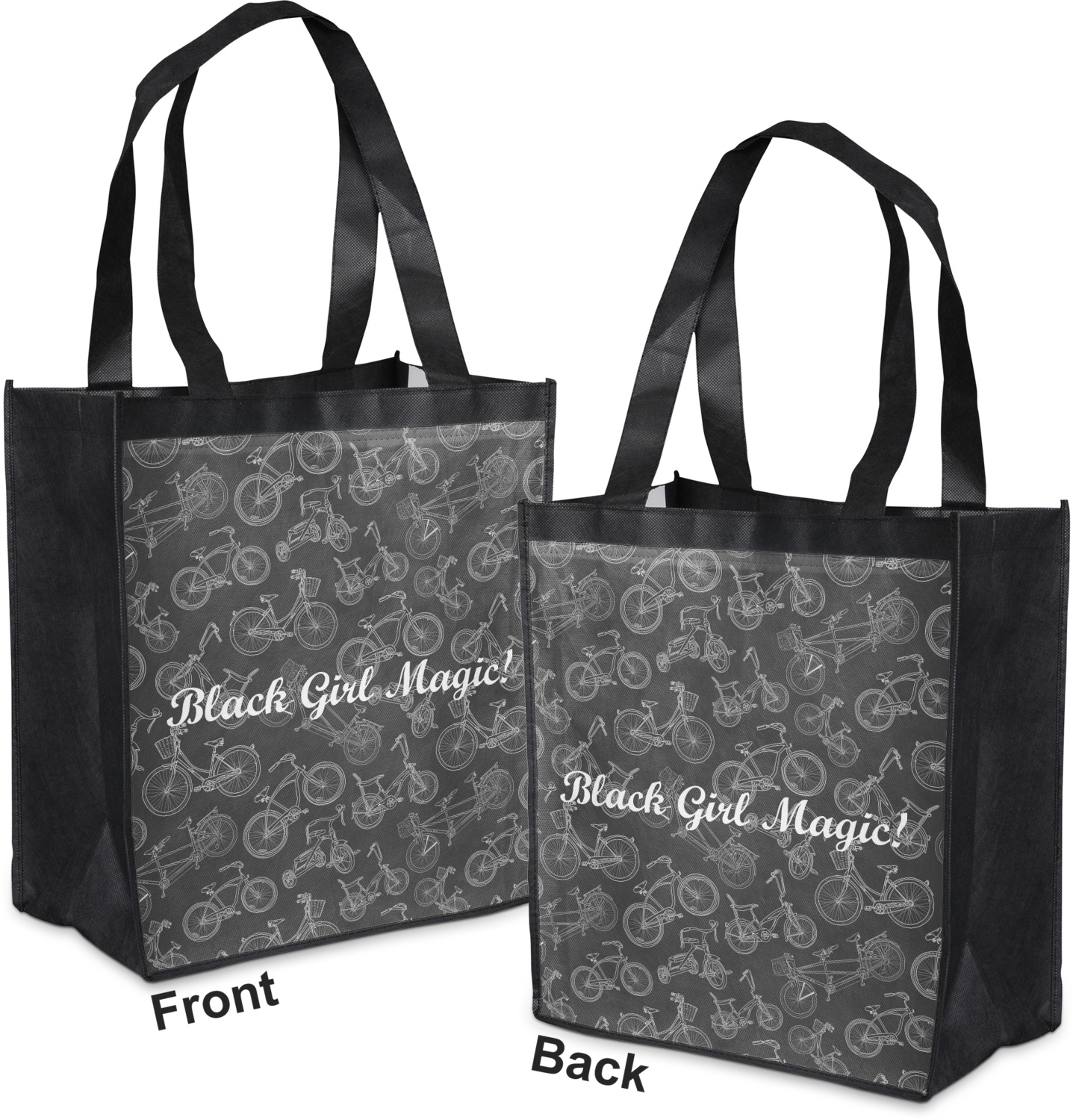 Made from a durable, biodegradable material, these reusable shopping bags can support up to 30 pounds of weight. With two large handles, measuring at 8.5 inches each, these personalized tote bags are easy to carry to your vehicle or home. The bag itself is 12 by 13.5 inches, and can expand to a depth of 7 inches. Your customization is printed on both the front and back, while the remaining sides, trim, and handle are a sleek, charcoal black.