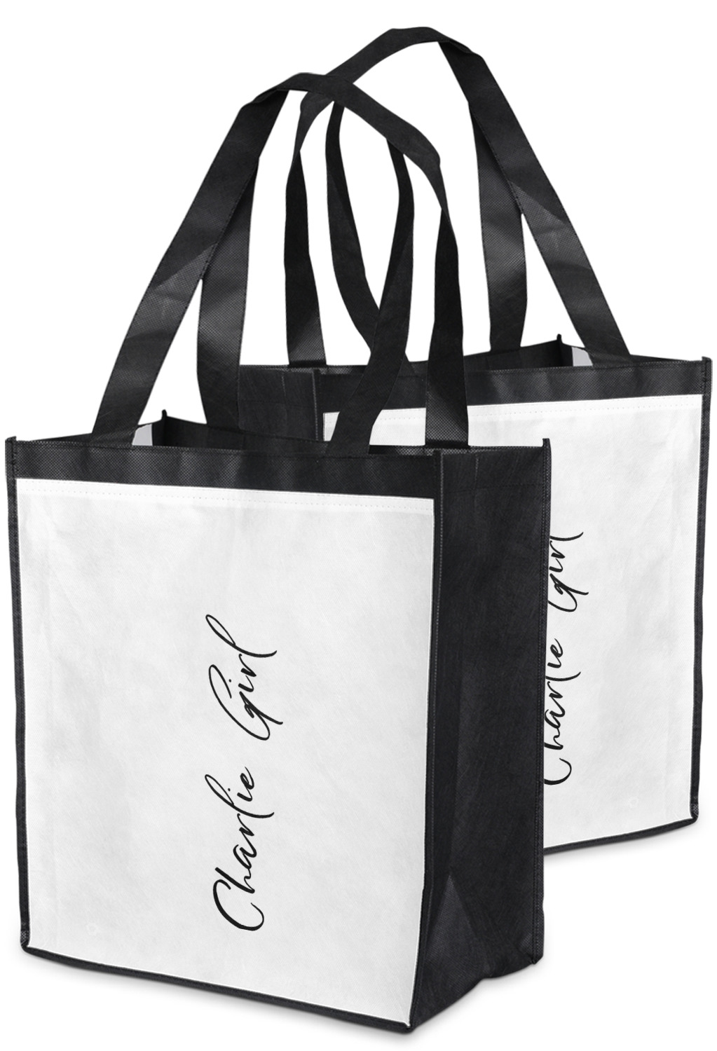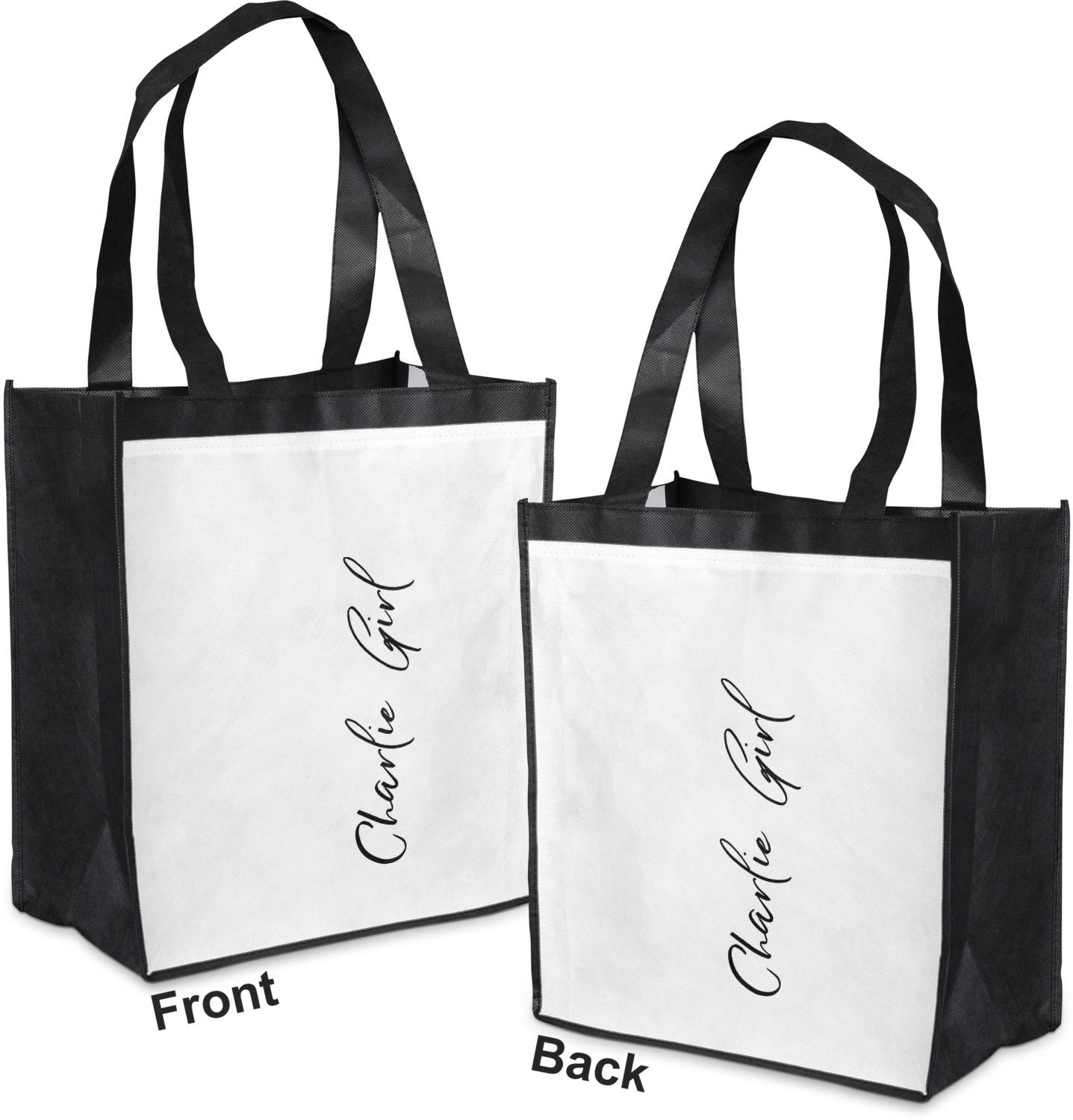 Made from a durable, biodegradable material, these reusable shopping bags can support up to 30 pounds of weight. With two large handles, measuring at 8.5 inches each, these personalized tote bags are easy to carry to your vehicle or home. The bag itself is 12 by 13.5 inches, and can expand to a depth of 7 inches. Your customization is printed on both the front and back, while the remaining sides, trim, and handle are a sleek, charcoal black.