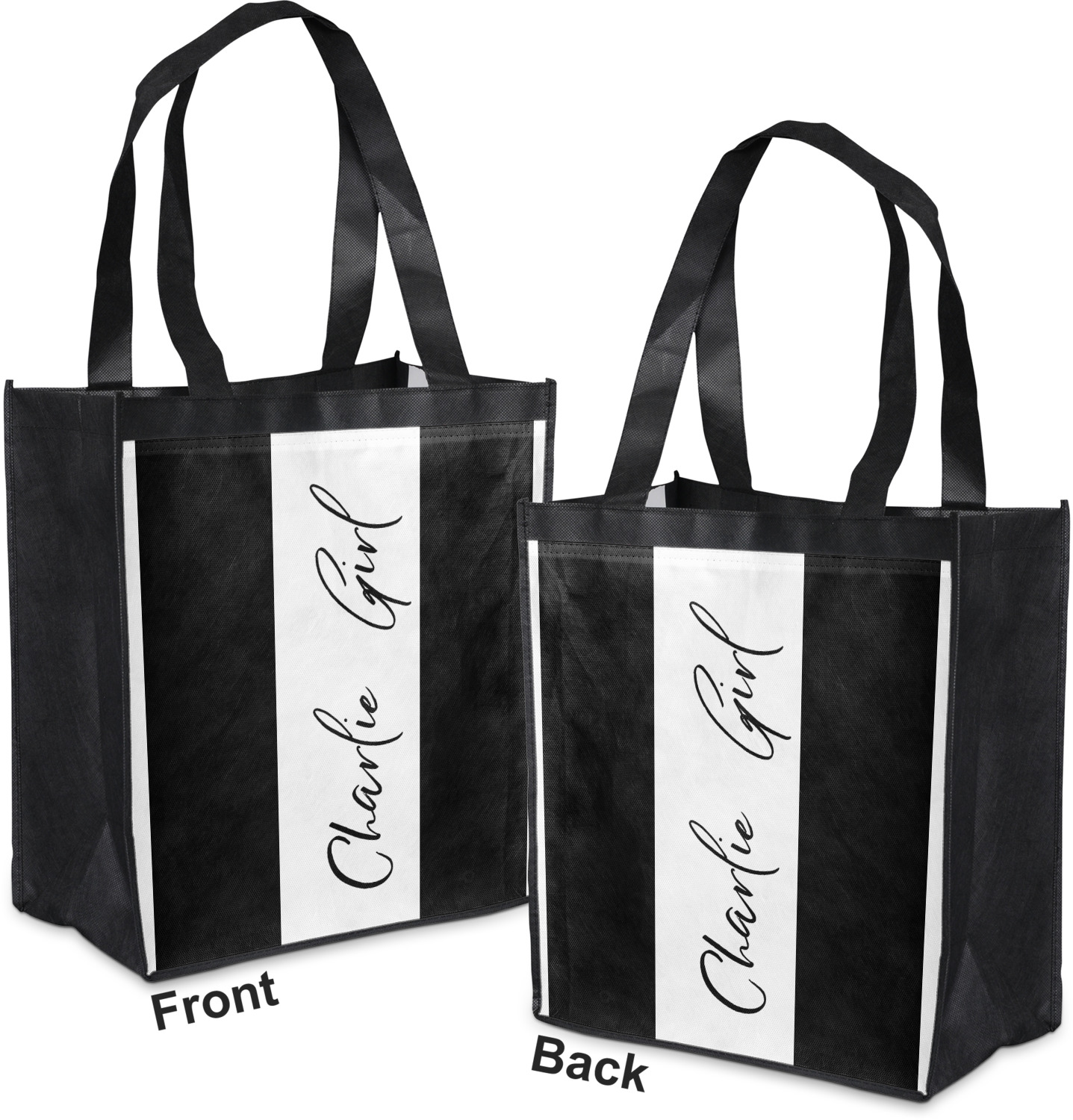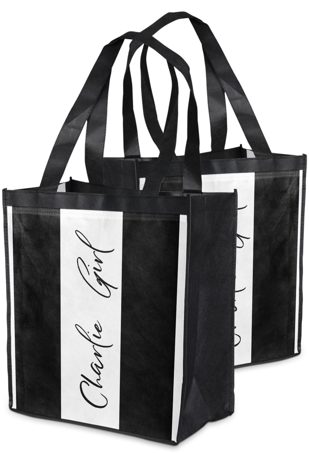 Made from a durable, biodegradable material, these reusable shopping bags can support up to 30 pounds of weight. With two large handles, measuring at 8.5 inches each, these personalized tote bags are easy to carry to your vehicle or home. The bag itself is 12 by 13.5 inches, and can expand to a depth of 7 inches. Your customization is printed on both the front and back, while the remaining sides, trim, and handle are a sleek, charcoal black.
