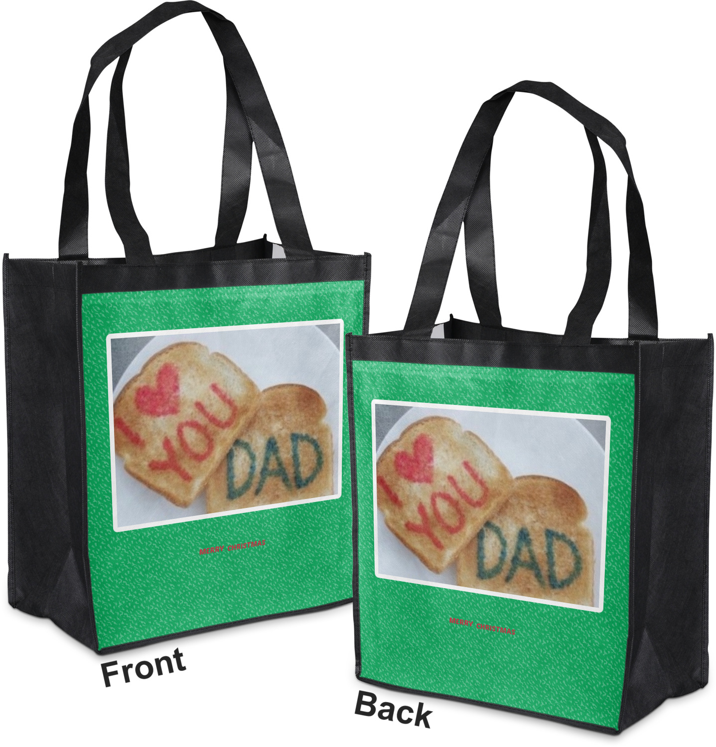 Made from a durable, biodegradable material, these reusable shopping bags can support up to 30 pounds of weight. With two large handles, measuring at 8.5 inches each, these personalized tote bags are easy to carry to your vehicle or home. The bag itself is 12 by 13.5 inches, and can expand to a depth of 7 inches. Your customization is printed on both the front and back, while the remaining sides, trim, and handle are a sleek, charcoal black.