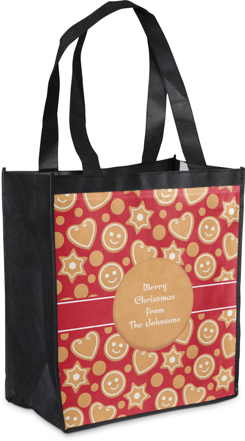 Made from a durable, biodegradable material, these reusable shopping bags can support up to 30 pounds of weight. With two large handles, measuring at 8.5 inches each, these personalized tote bags are easy to carry to your vehicle or home. The bag itself is 12 by 13.5 inches, and can expand to a depth of 7 inches. Your customization is printed on both the front and back, while the remaining sides, trim, and handle are a sleek, charcoal black.