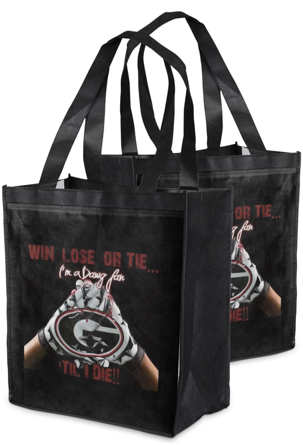 Made from a durable, biodegradable material, these reusable shopping bags can support up to 30 pounds of weight. With two large handles, measuring at 8.5 inches each, these personalized tote bags are easy to carry to your vehicle or home. The bag itself is 12 by 13.5 inches, and can expand to a depth of 7 inches. Your customization is printed on both the front and back, while the remaining sides, trim, and handle are a sleek, charcoal black.