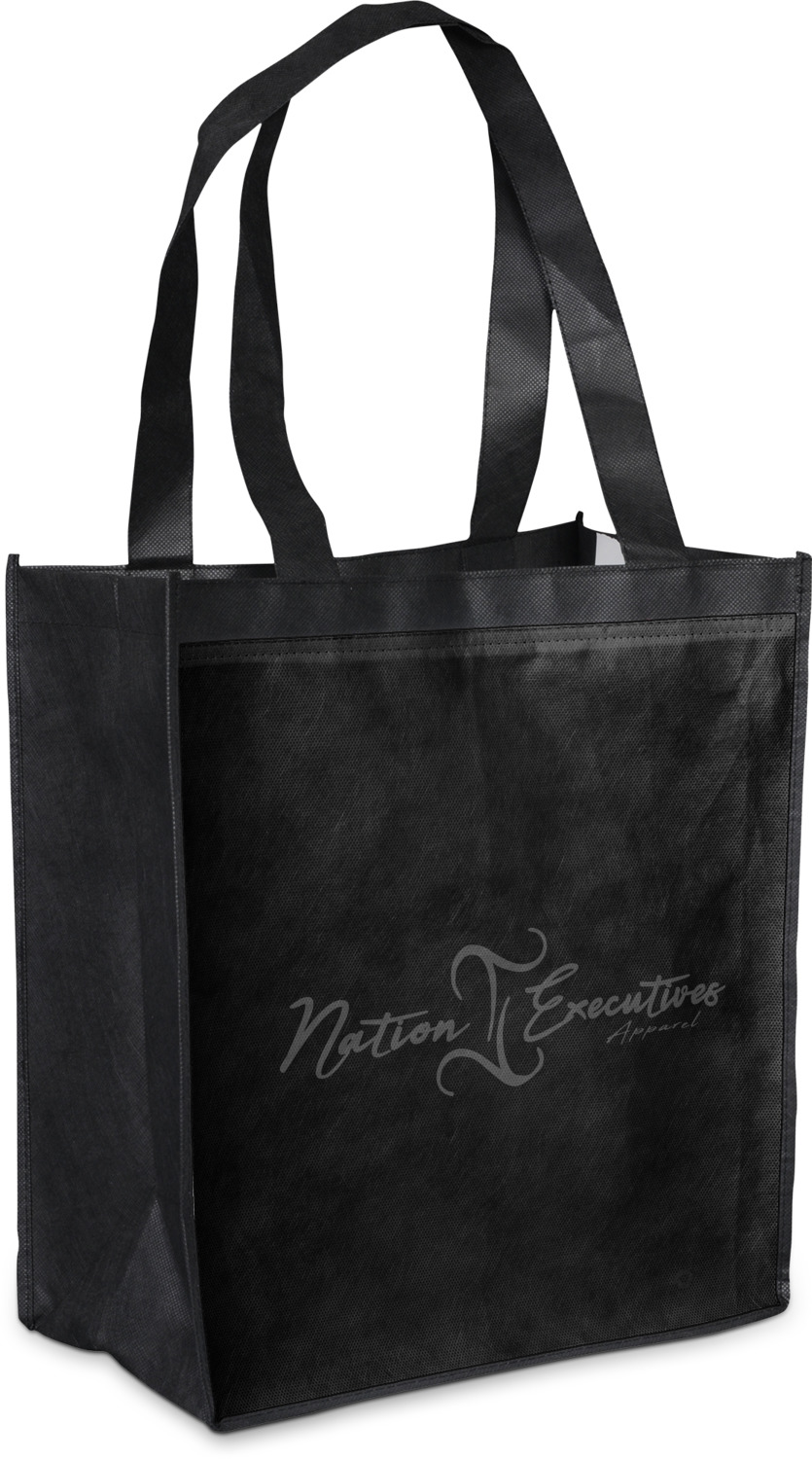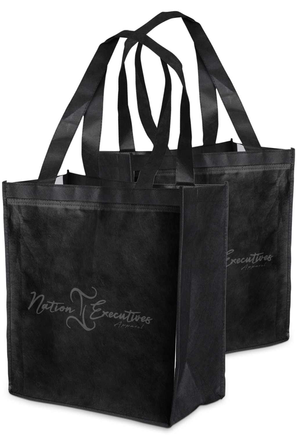 Made from a durable, biodegradable material, these reusable shopping bags can support up to 30 pounds of weight. With two large handles, measuring at 8.5 inches each, these personalized tote bags are easy to carry to your vehicle or home. The bag itself is 12 by 13.5 inches, and can expand to a depth of 7 inches. Your customization is printed on both the front and back, while the remaining sides, trim, and handle are a sleek, charcoal black.