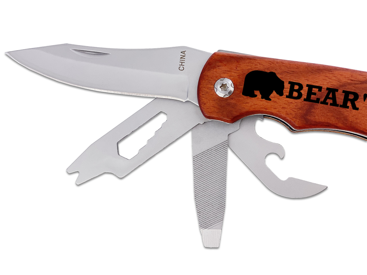 This multitool has all the tools you need on a daily basis. This multi-tool has a knife, file, bottle and can opener, screwdriver, and a hex nut wrench as well as the hammer and an adjustable wrench. The rosewood handle can be laser engraved on one or both sides to your liking to add that special personal touch for the user. Includes a black fabric pouch with belt loop for storage. Also includes white gift box.