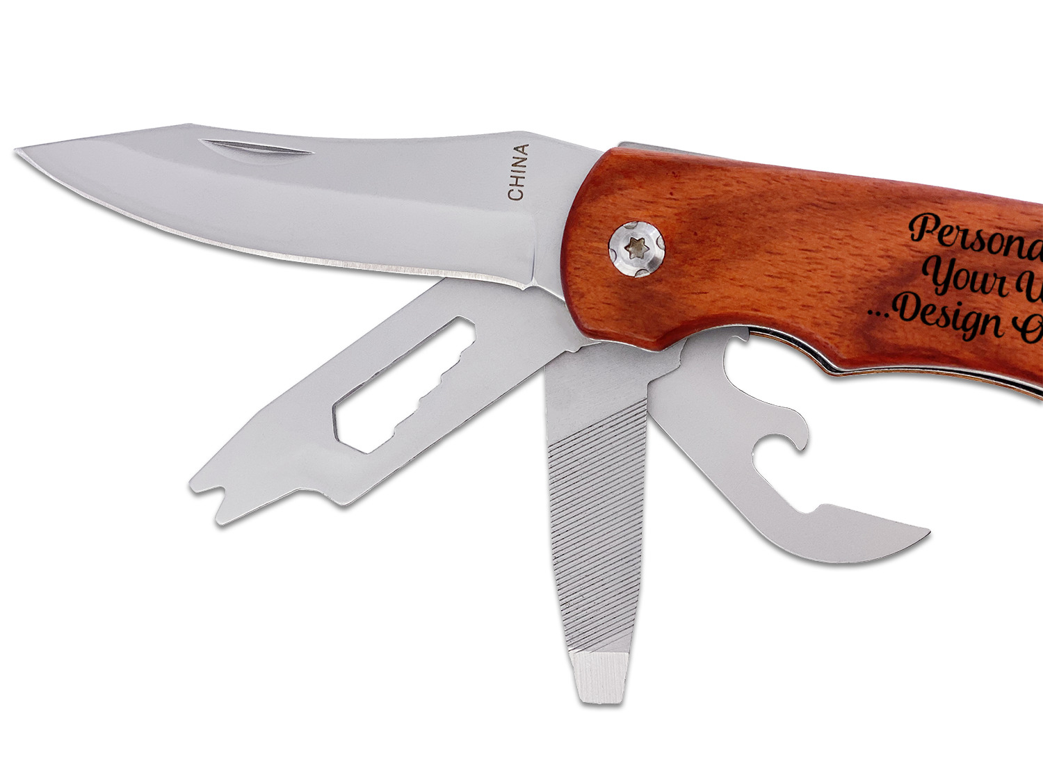 This multitool has all the tools you need on a daily basis. This multi-tool has a knife, file, bottle and can opener, screwdriver, and a hex nut wrench as well as the hammer and an adjustable wrench. The rosewood handle can be laser engraved on one or both sides to your liking to add that special personal touch for the user. Includes a black fabric pouch with belt loop for storage. Also includes white gift box.