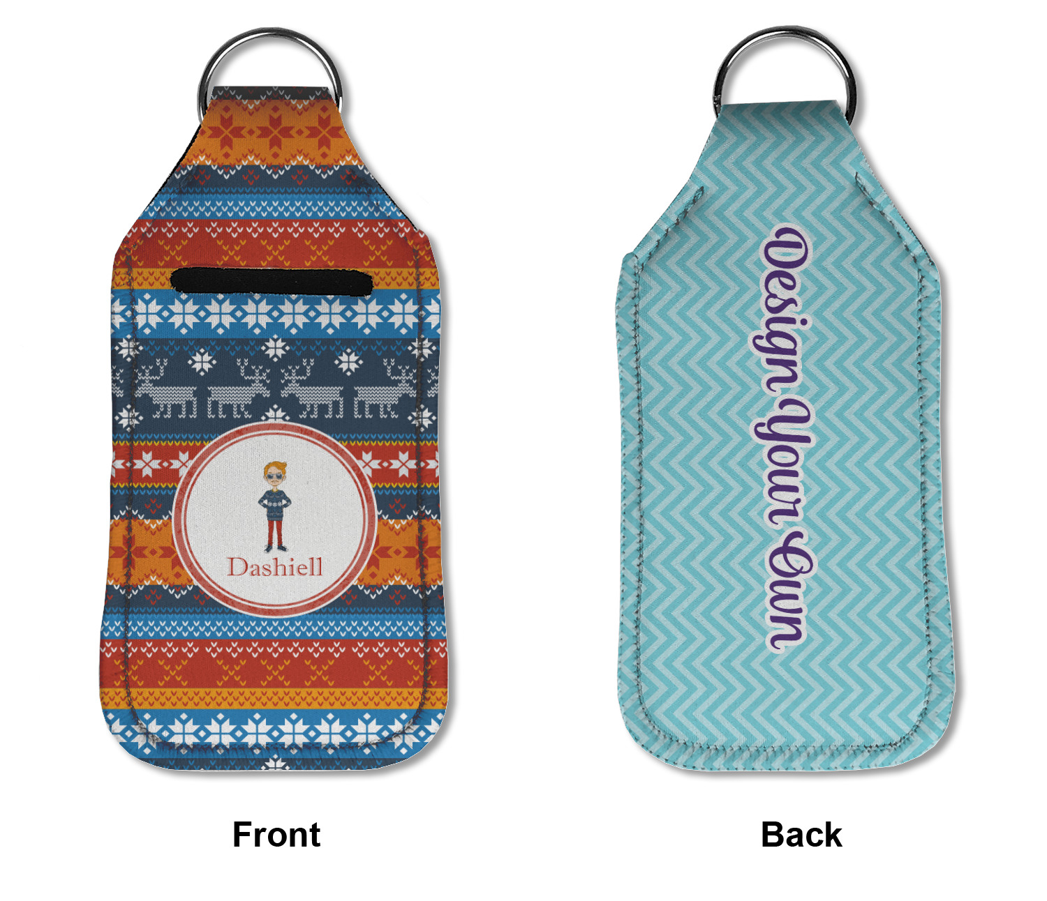 Each hand sanitizer holder comes with its own empty travel-sized, refillable hand sanitizer sure to fit snug in your customized sanitizer case! Our hand sanitizer cases are a durable, yet soft neoprene material sure to last any daily activities or travel agenda. Customize and personalize a hand sanitizer bottle holder with one of our two sizes - small (4.25" x 2.25") or large (5.5" x 2.5"). Each travel sanitizer holder comes with a keyring for attachment on bags, keys, or more!