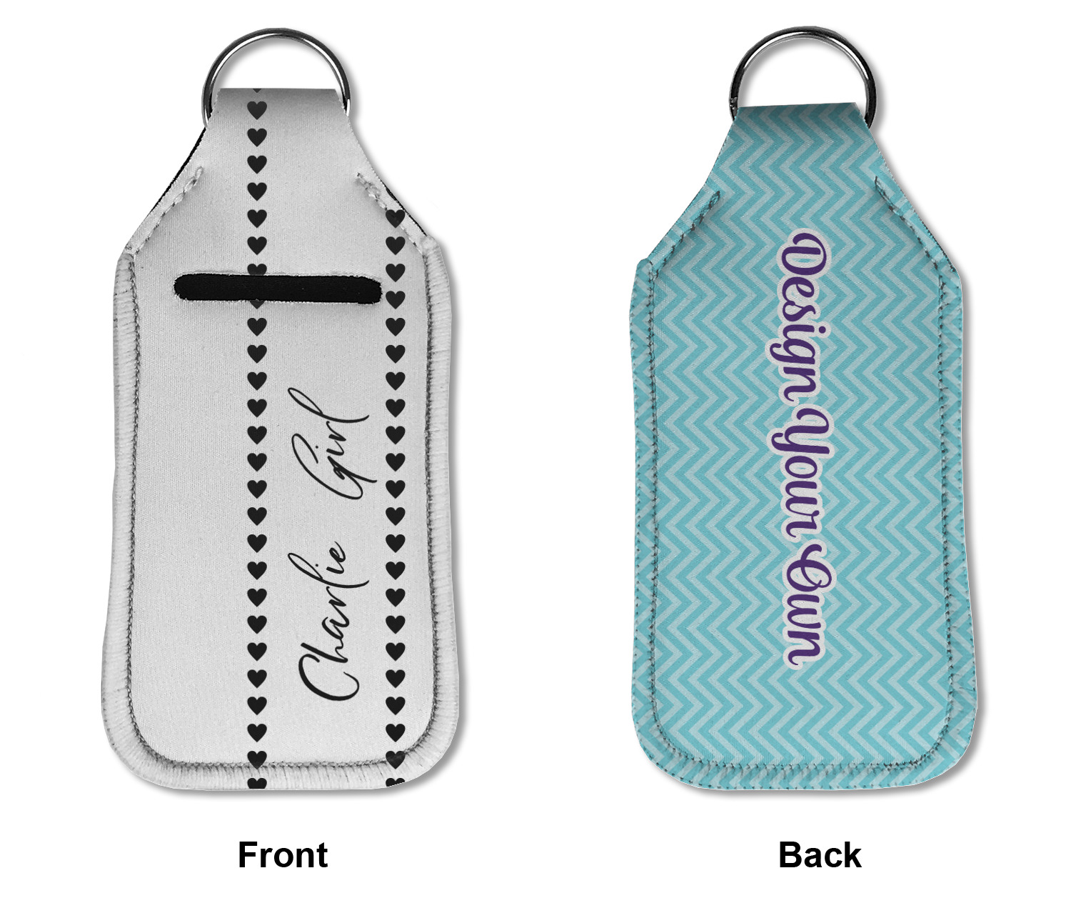 Each hand sanitizer holder comes with its own empty travel-sized, refillable hand sanitizer sure to fit snug in your customized sanitizer case! Our hand sanitizer cases are a durable, yet soft neoprene material sure to last any daily activities or travel agenda. Customize and personalize a hand sanitizer bottle holder with one of our two sizes - small (4.25" x 2.25") or large (5.5" x 2.5"). Each travel sanitizer holder comes with a keyring for attachment on bags, keys, or more!