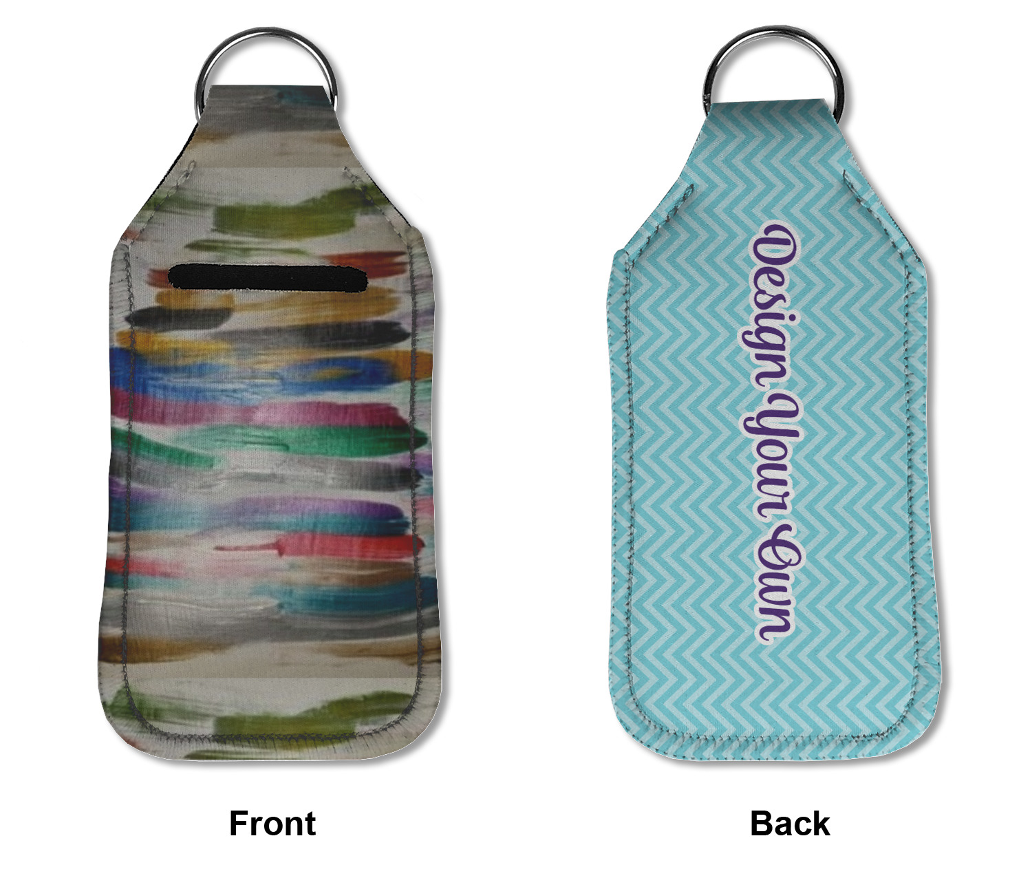 Each hand sanitizer holder comes with its own empty travel-sized, refillable hand sanitizer sure to fit snug in your customized sanitizer case! Our hand sanitizer cases are a durable, yet soft neoprene material sure to last any daily activities or travel agenda. Customize and personalize a hand sanitizer bottle holder with one of our two sizes - small (4.25" x 2.25") or large (5.5" x 2.5"). Each travel sanitizer holder comes with a keyring for attachment on bags, keys, or more!