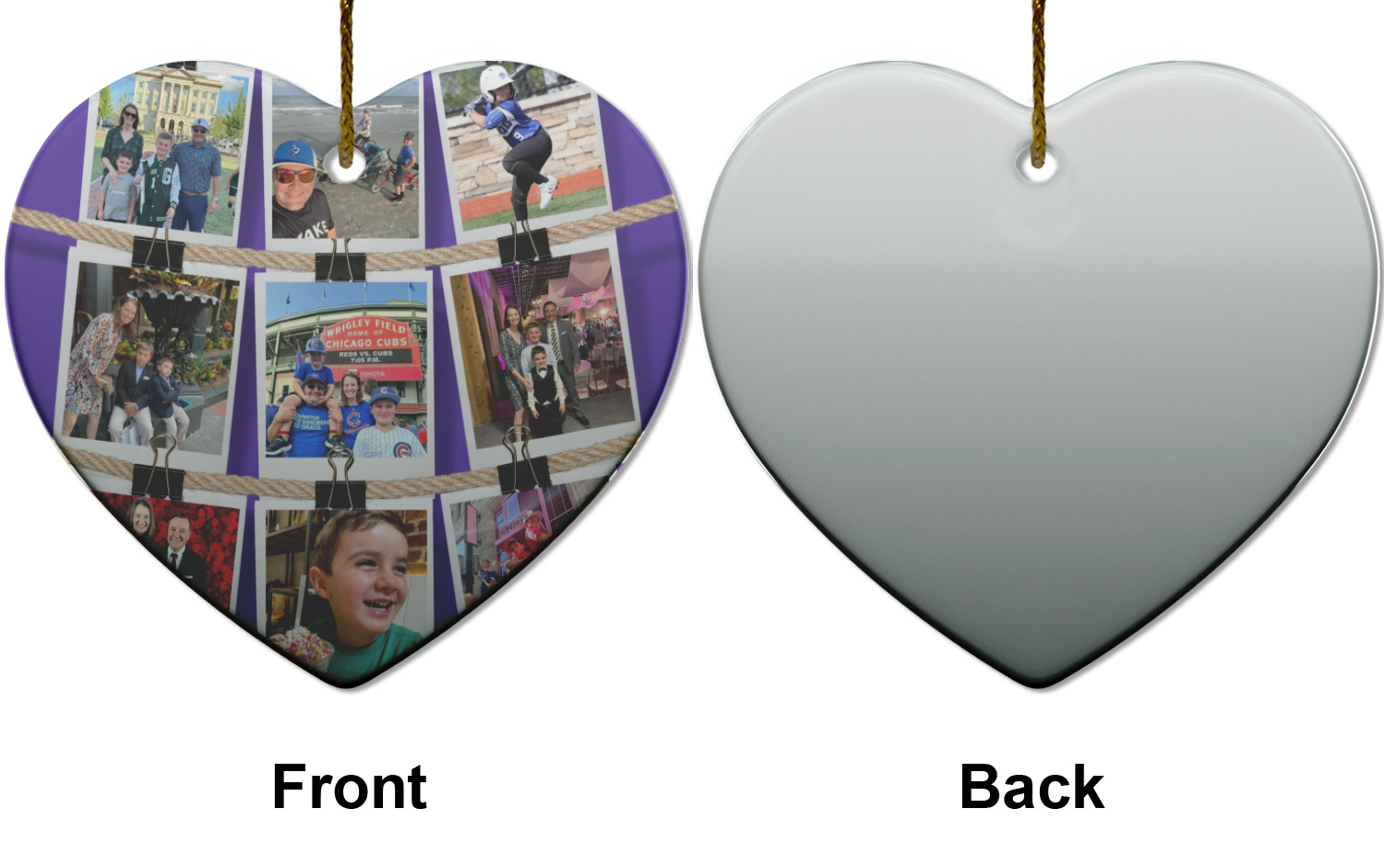 Have a happy holiday and share the joy of Christmas with your loved ones by hanging up personalized ceramic ornaments! Ornaments add a touch of who you are and the things you love onto the Christmas tree! Create custom ornaments for the kids and have them hang up their own star with their name, or pay remembrance this holiday to missed loved ones with our ceramic heart ornament. Browse many of our unique designs and customize them the way you'd like! From monograms, logos, and patterns, we have it all! You can even upload a photo of your family for us to print onto the ornament! The possibilities are endless!