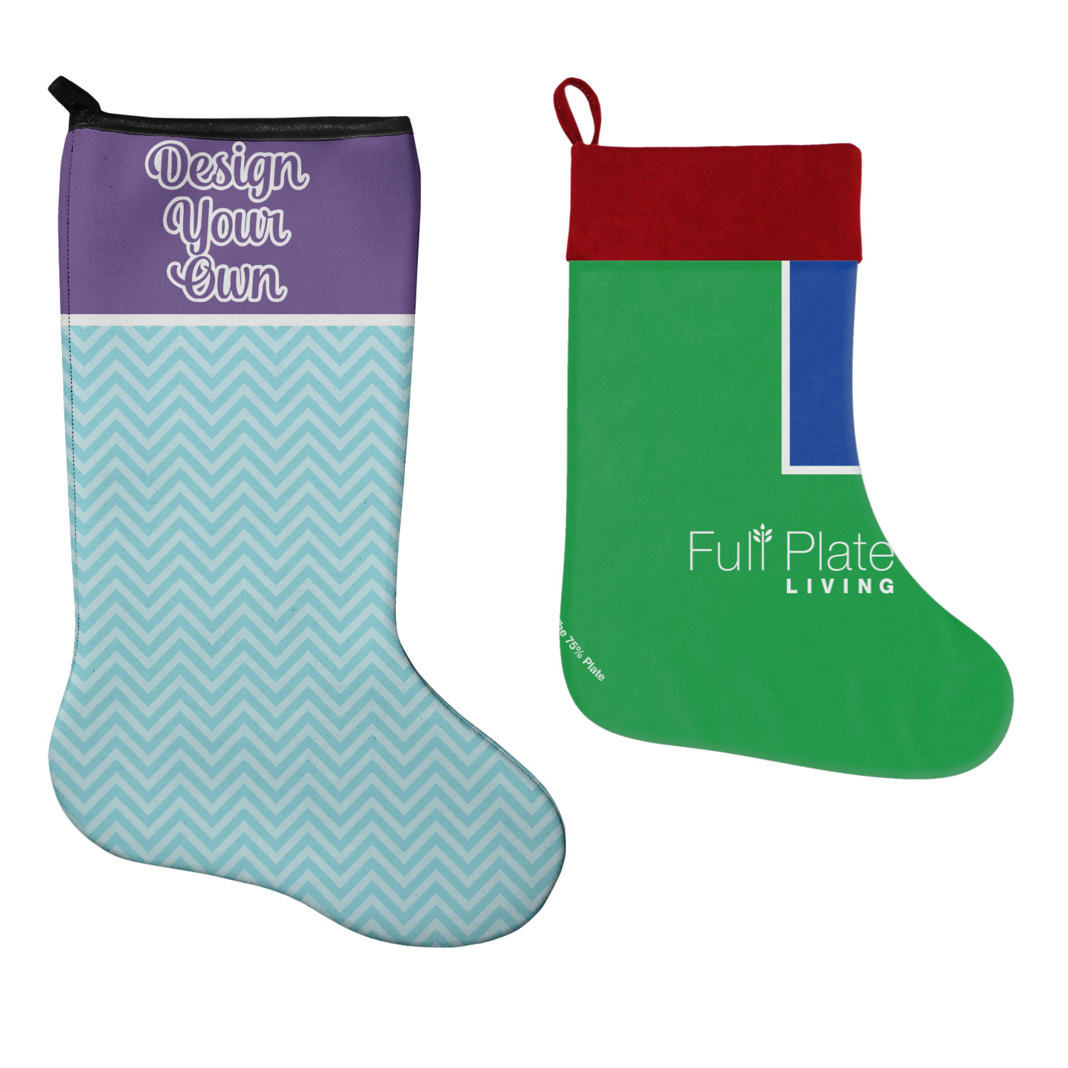 These 17" x 11" stockings are made of neoprene and have a black trim to give them a fantastic finished look. Your very own design is printed right onto the stocking, either single sided with white on the back or double sided where can use the same or different designs / patterns on the front and the back - the choice is yours. At the top of the stocking is a 2" loop for hanging.
