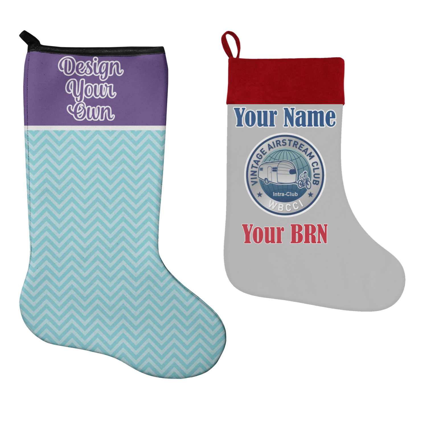 These 17" x 11" stockings are made of neoprene and have a black trim to give them a fantastic finished look. Your very own design is printed right onto the stocking, either single sided with white on the back or double sided where can use the same or different designs / patterns on the front and the back - the choice is yours. At the top of the stocking is a 2" loop for hanging.