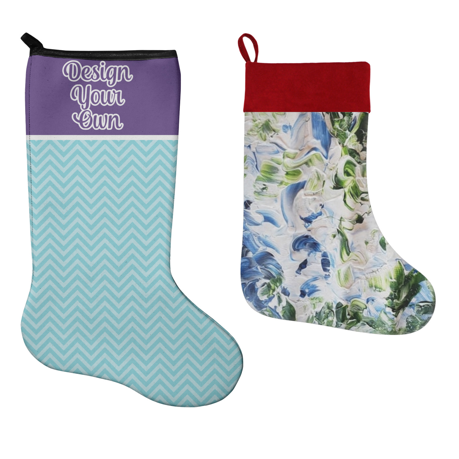 These 17" x 11" stockings are made of neoprene and have a black trim to give them a fantastic finished look. Your very own design is printed right onto the stocking, either single sided with white on the back or double sided where can use the same or different designs / patterns on the front and the back - the choice is yours. At the top of the stocking is a 2" loop for hanging.
