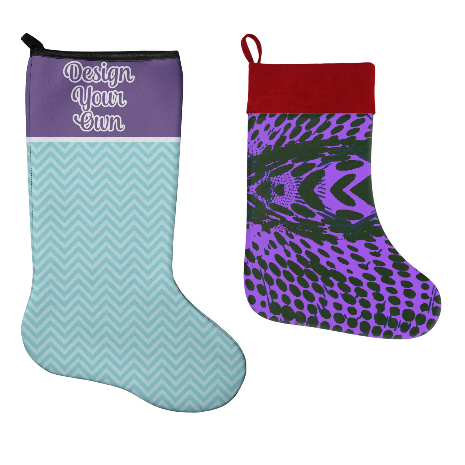 These 17" x 11" stockings are made of neoprene and have a black trim to give them a fantastic finished look. Your very own design is printed right onto the stocking, either single sided with white on the back or double sided where can use the same or different designs / patterns on the front and the back - the choice is yours. At the top of the stocking is a 2" loop for hanging.