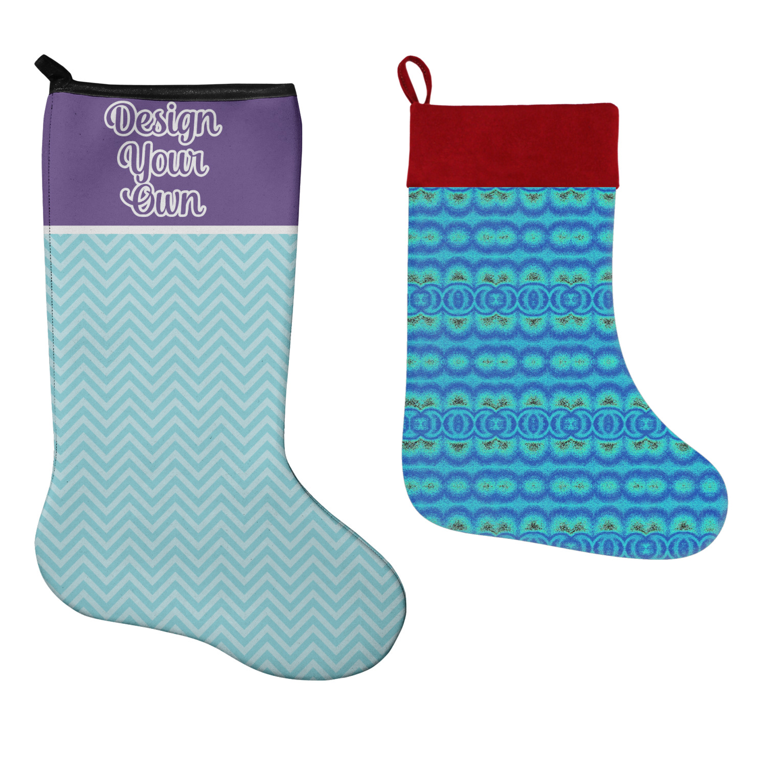 These 17" x 11" stockings are made of neoprene and have a black trim to give them a fantastic finished look. Your very own design is printed right onto the stocking, either single sided with white on the back or double sided where can use the same or different designs / patterns on the front and the back - the choice is yours. At the top of the stocking is a 2" loop for hanging.
