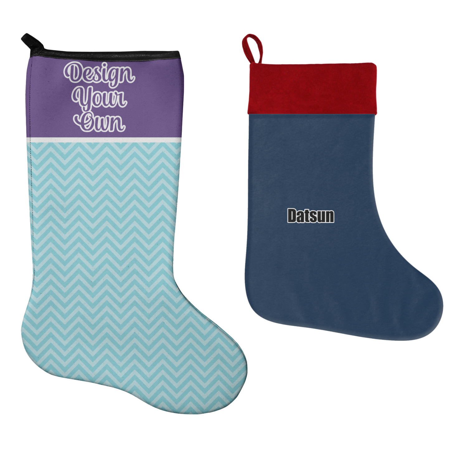 These 17" x 11" stockings are made of neoprene and have a black trim to give them a fantastic finished look. Your very own design is printed right onto the stocking, either single sided with white on the back or double sided where can use the same or different designs / patterns on the front and the back - the choice is yours. At the top of the stocking is a 2" loop for hanging.