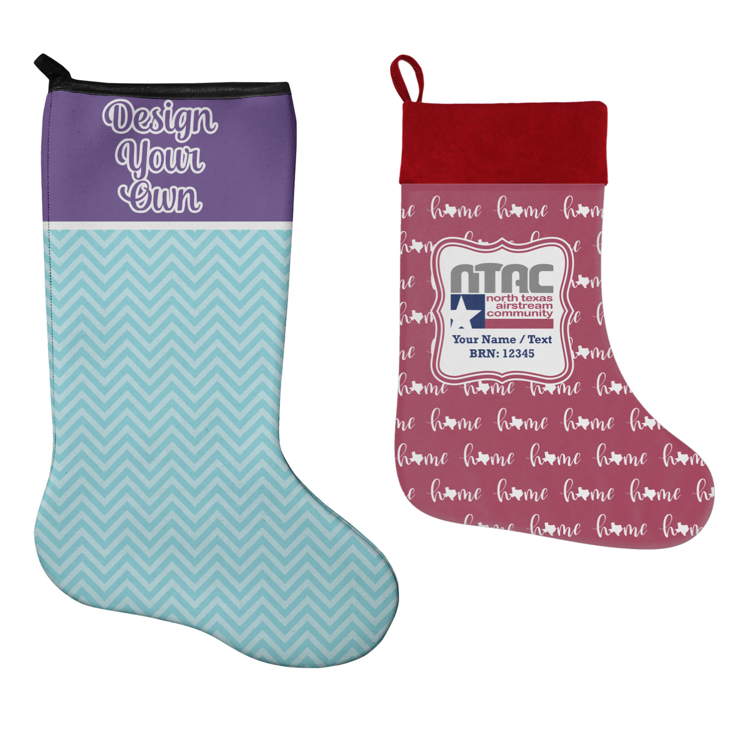 These 17" x 11" stockings are made of neoprene and have a black trim to give them a fantastic finished look. Your very own design is printed right onto the stocking, either single sided with white on the back or double sided where can use the same or different designs / patterns on the front and the back - the choice is yours. At the top of the stocking is a 2" loop for hanging.