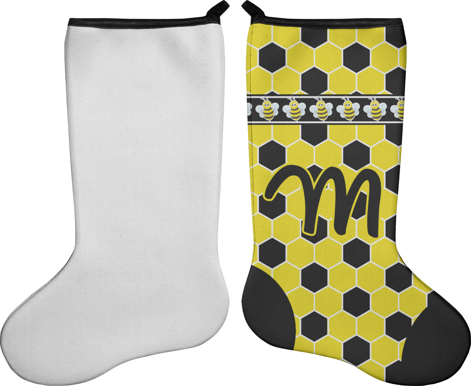 These 17" x 11" stockings are made of neoprene and have a black trim to give them a fantastic finished look. Your very own design is printed right onto the stocking, either single sided with white on the back or double sided where can use the same or different designs / patterns on the front and the back - the choice is yours. At the top of the stocking is a 2" loop for hanging.