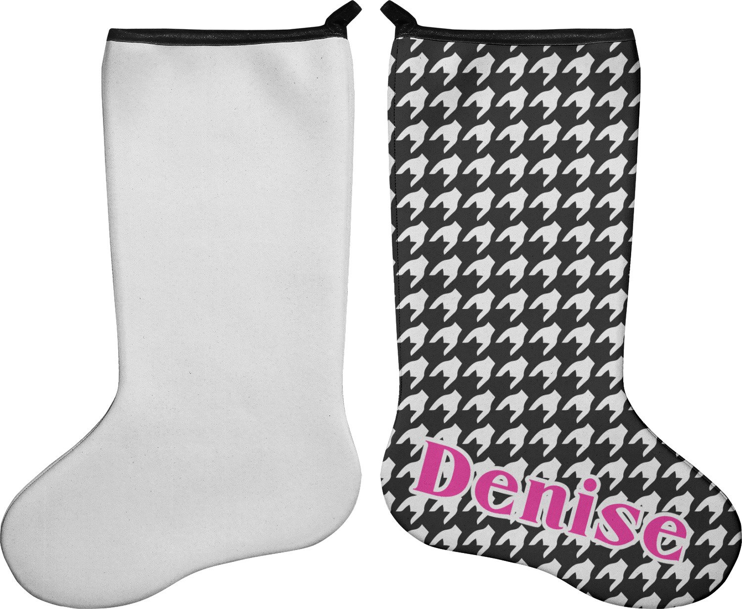 These 17" x 11" stockings are made of neoprene and have a black trim to give them a fantastic finished look. Your very own design is printed right onto the stocking, either single sided with white on the back or double sided where can use the same or different designs / patterns on the front and the back - the choice is yours. At the top of the stocking is a 2" loop for hanging.
