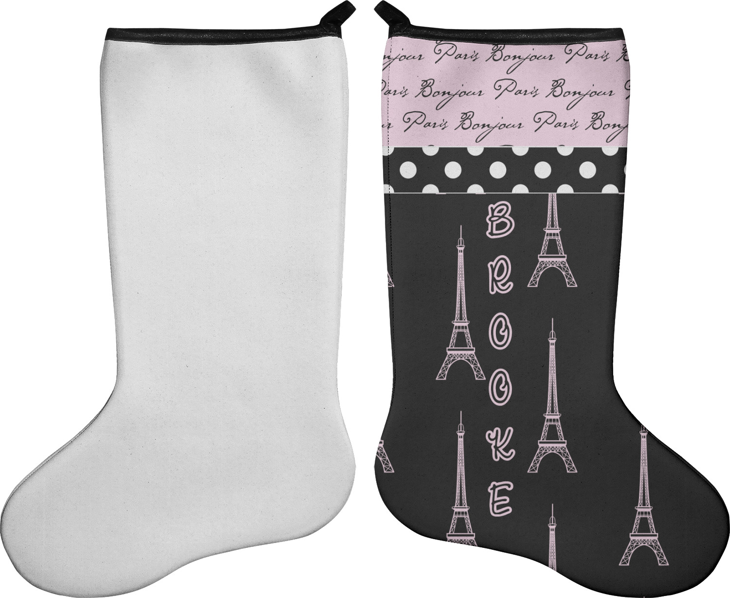 These 17" x 11" stockings are made of neoprene and have a black trim to give them a fantastic finished look. Your very own design is printed right onto the stocking, either single sided with white on the back or double sided where can use the same or different designs / patterns on the front and the back - the choice is yours. At the top of the stocking is a 2" loop for hanging.