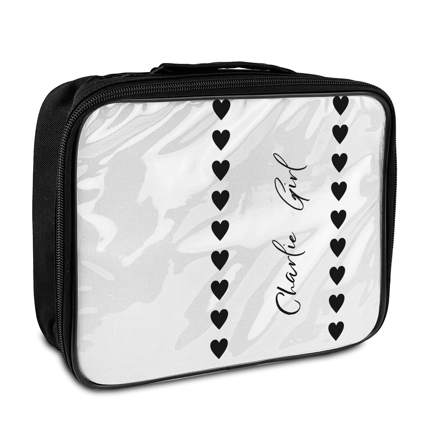 The exterior these personalized lunch bags are fabricated from a thick, durable nylon, while the inside features an effective thermal insulation. A black zipper lines all edges of the lunch bag. The front panel has a clear vinyl protective covering over the customized panel to ensure it stays clean and nice looking for a long time.