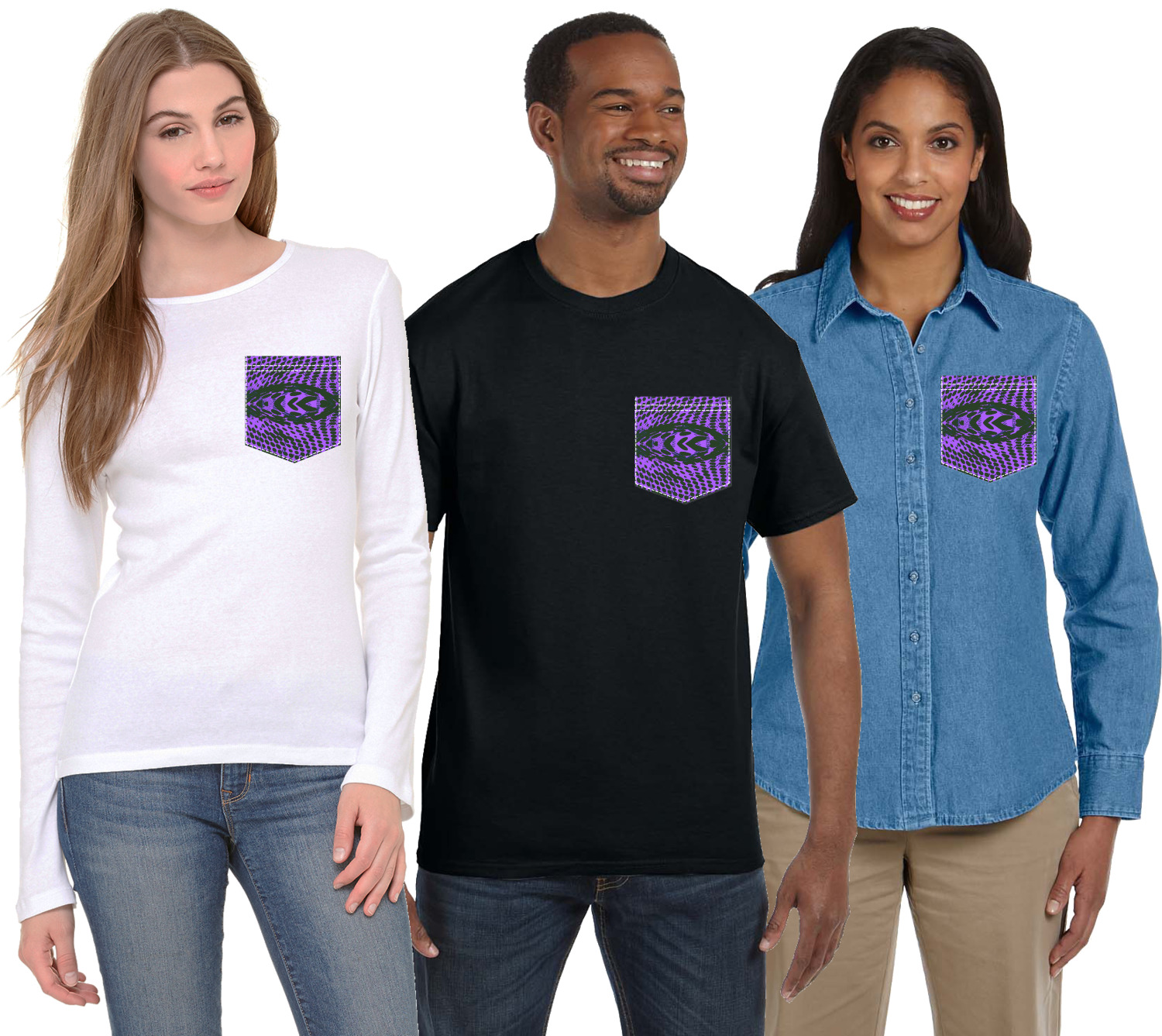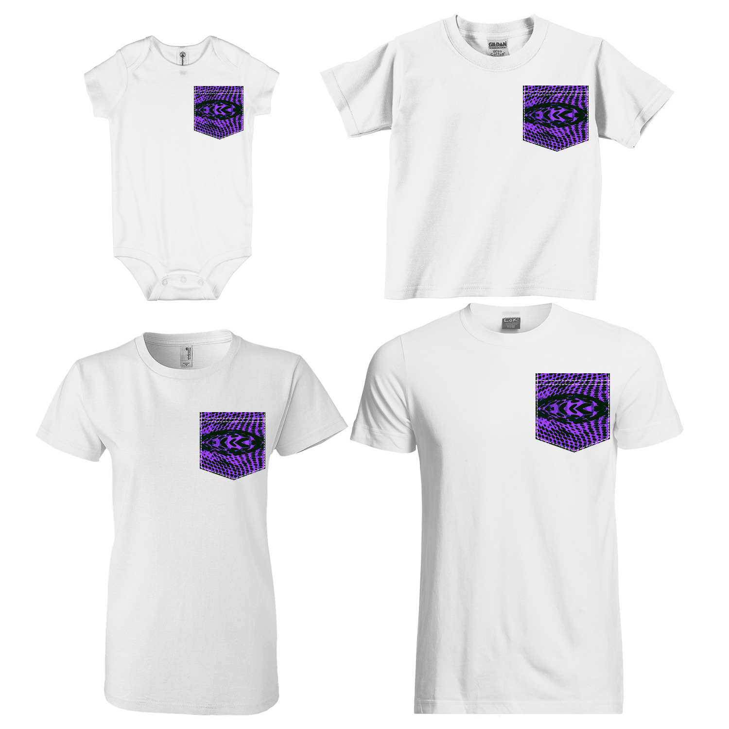 The faux pockets are available in 4 different sizes - for baby, kids, youth/women & men; the whole family can have the same pocket design, but sized just for them! The pockets are printed using our direct-to-film technology to the exact shape & size. We have faux stitching around the pocket, with double stitching on the top of the pocket to give it the authentic pocket look!