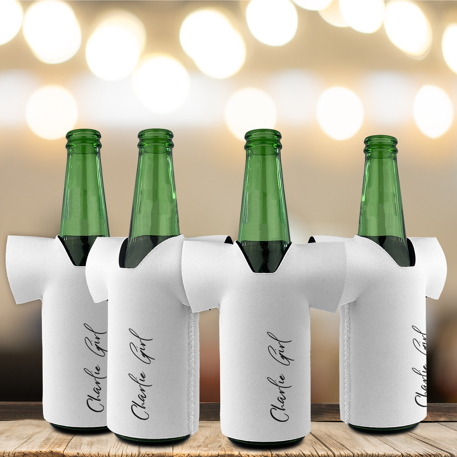 Fabricated from a thick, insulating neoprene, these custom can sleeve keep your drink cold, while proudly displaying your customization on all sides. These can sleeves are designed to fit most 12oz bottles. Available in two types - zipper cooler for insulating the full bottle or the jersey style for sports season. Also available as a single can sleeve or in a set of 4 for you to share with friends and family. For convenient storage, they can also be folded.
