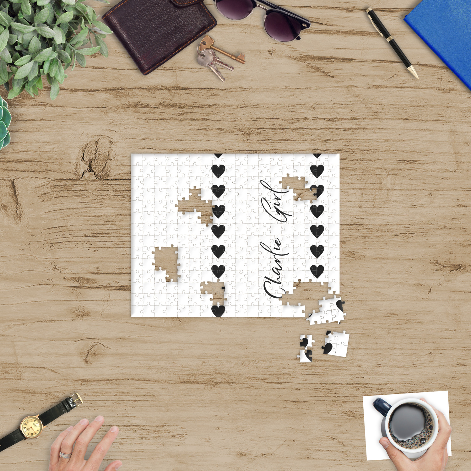 Depending on the look you are trying to achieve, you can add; a thematic pattern or background, with a photo in a frame and text or personalization to your puzzle. Basically if you can imagine it, you can design it!