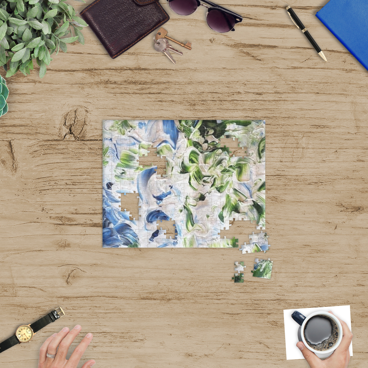 You can also upload your logo or art that you or your kids drew. To create more challenging jigsaw puzzles, you can create a pattern from with your logo or artwork. You can also add other elements such as text or personalization.