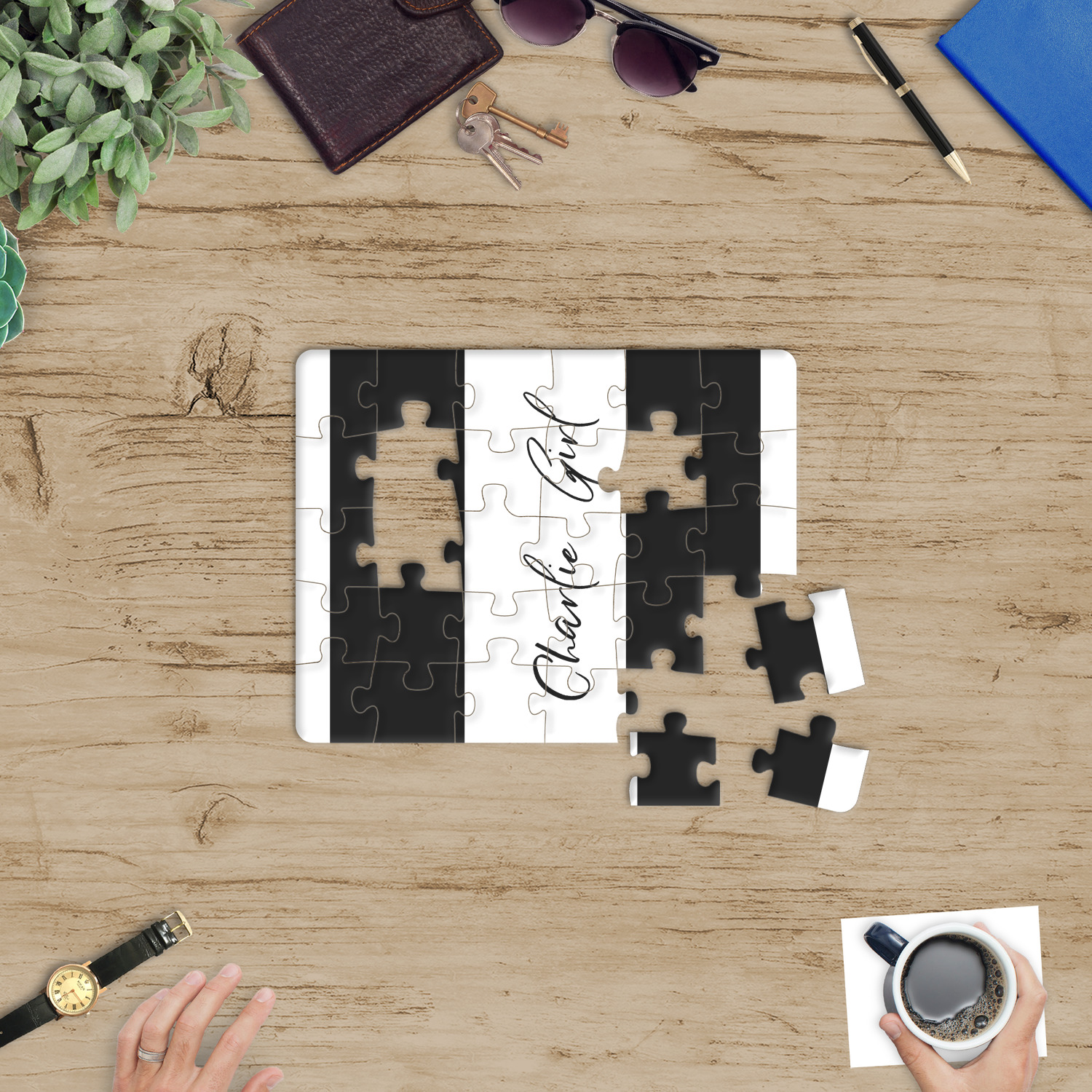 Depending on the look you are trying to achieve, you can add; a thematic pattern or background, with a photo in a frame and text or personalization to your puzzle. Basically if you can imagine it, you can design it!