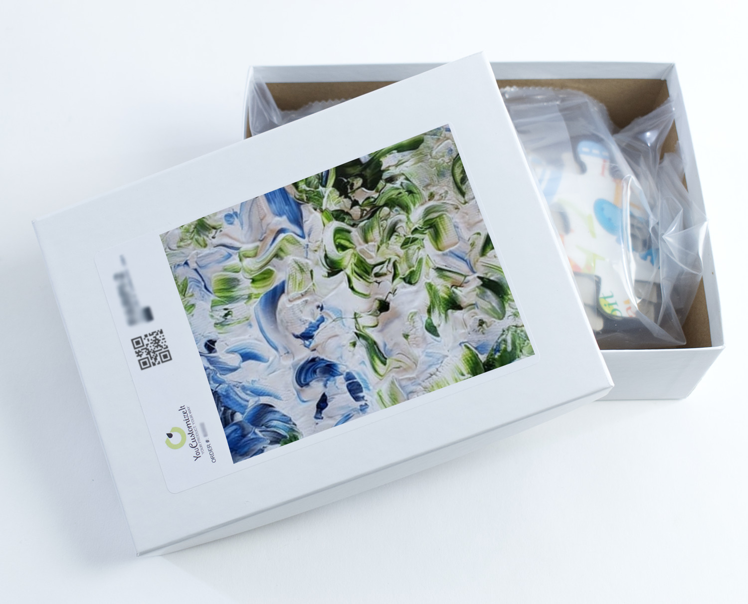 We print our puzzles on thick white chipboard in vibrant colors, then laminate the chipboard and die cut your puzzle. Your jigsaw puzzle is shipped to you in a box with the image of the puzzle on the box.