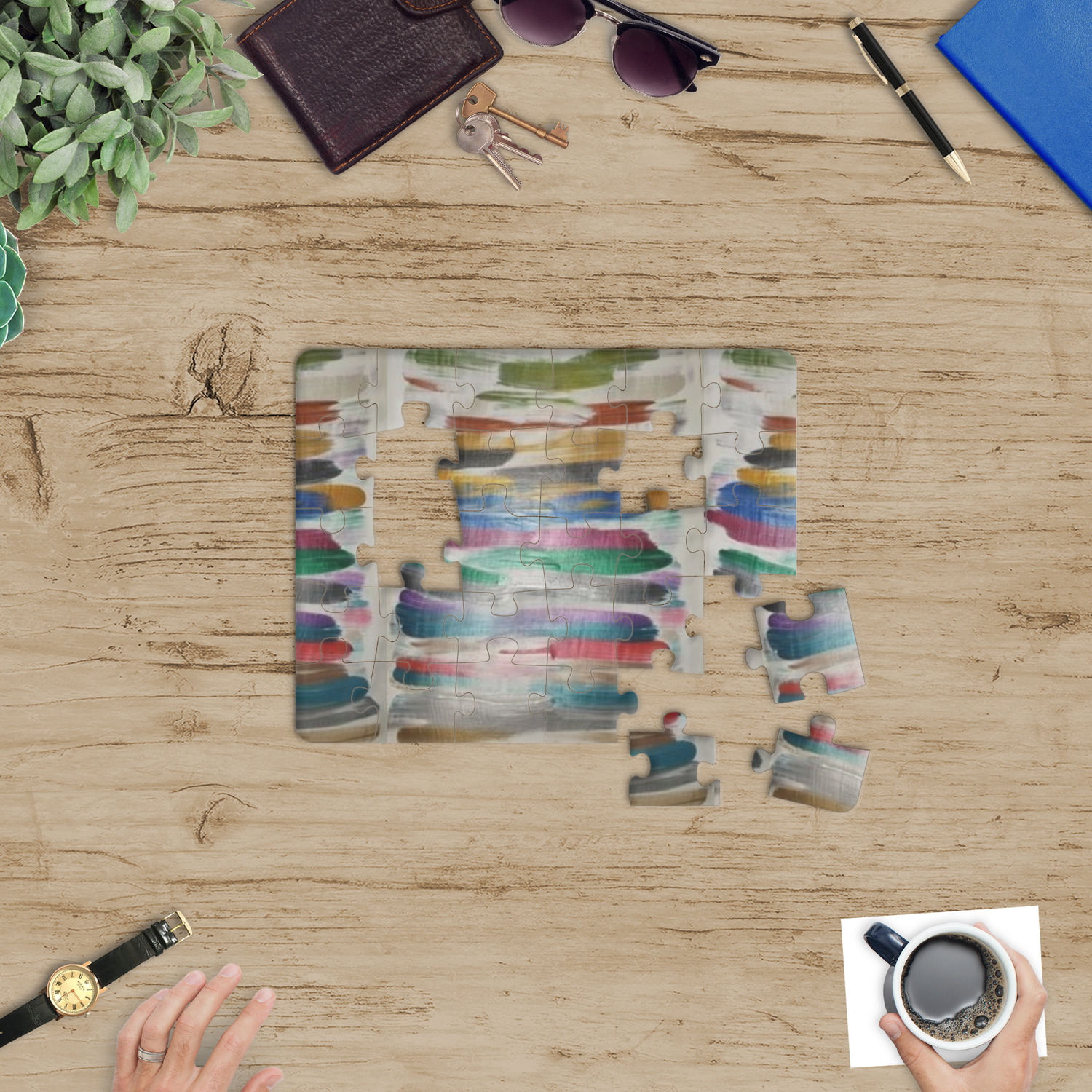 You can also upload your logo or art that you or your kids drew. To create more challenging jigsaw puzzles, you can create a pattern from with your logo or artwork. You can also add other elements such as text or personalization.