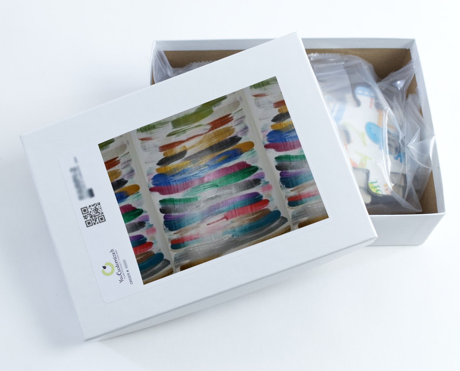 We print our puzzles on thick white chipboard in vibrant colors, then laminate the chipboard and die cut your puzzle. Your jigsaw puzzle is shipped to you in a box with the image of the puzzle on the box.