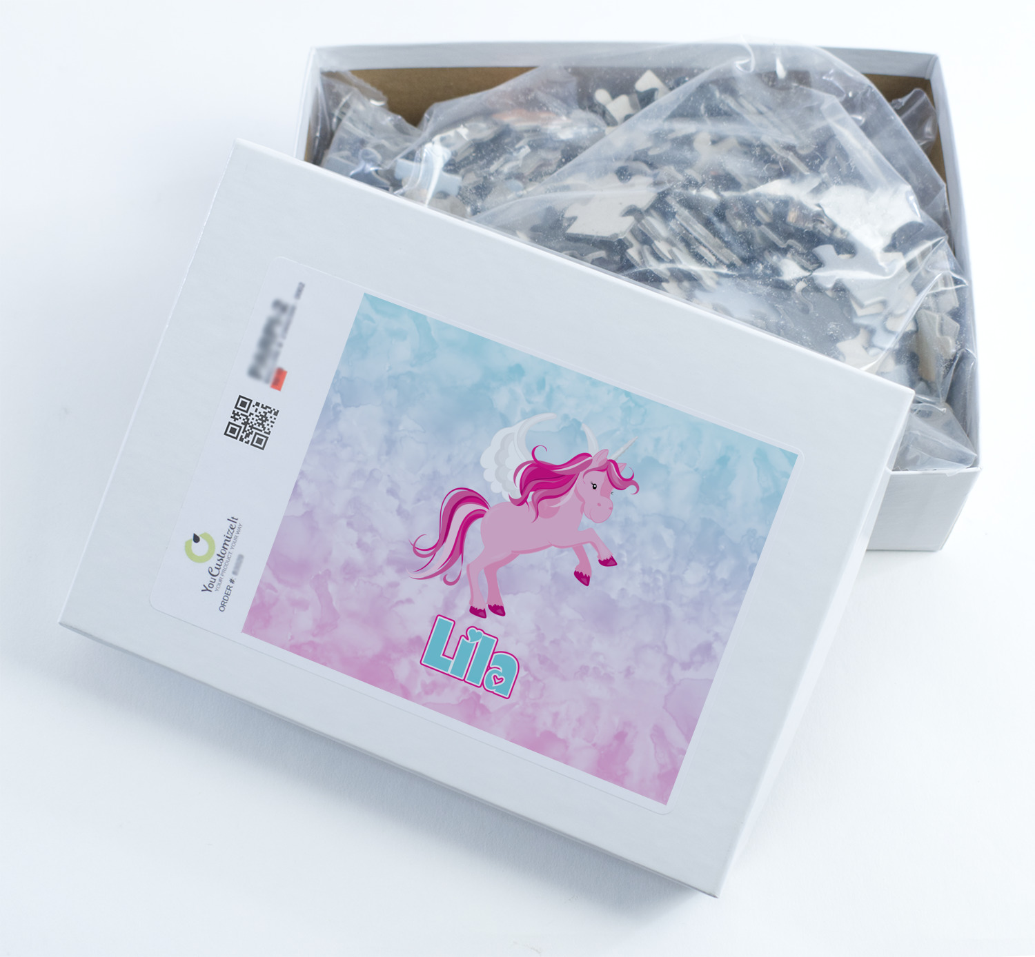 You can also upload your logo or art that you or your kids drew. To create more challenging jigsaw puzzles, you can create a pattern from with your logo or artwork. You can also add other elements such as text or personalization.