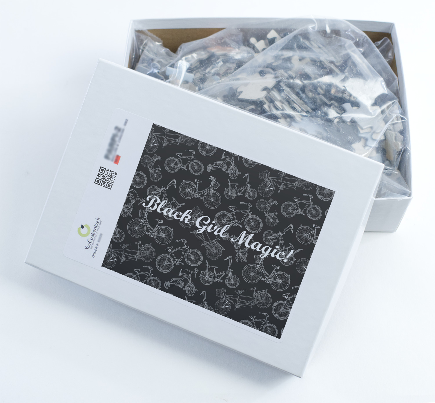 We print our puzzles on thick white chipboard in vibrant colors, then laminate the chipboard and die cut your puzzle. Your jigsaw puzzle is shipped to you in a box with the image of the puzzle on the box.
