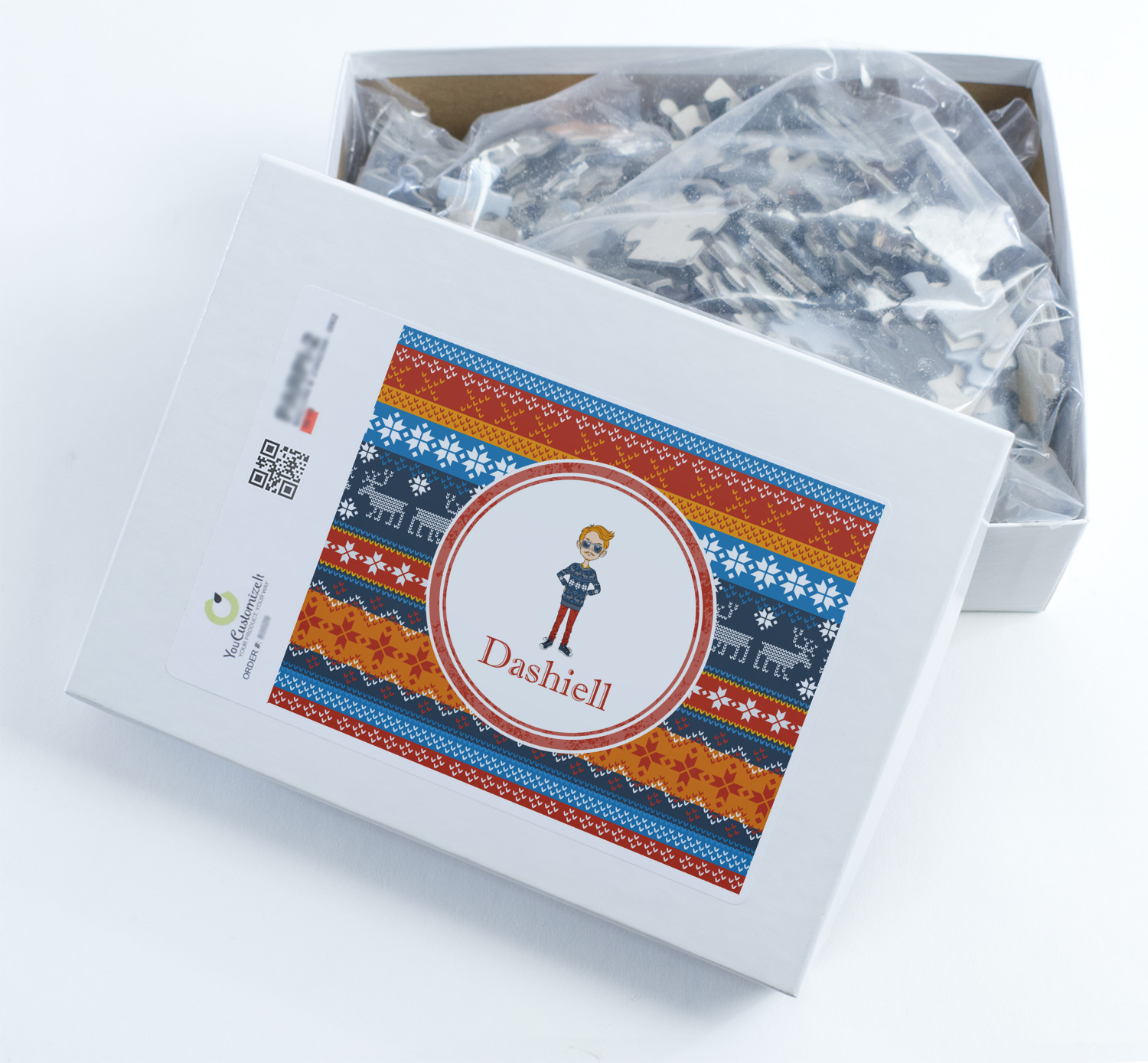 We print our puzzles on thick white chipboard in vibrant colors, then laminate the chipboard and die cut your puzzle. Your jigsaw puzzle is shipped to you in a box with the image of the puzzle on the box.