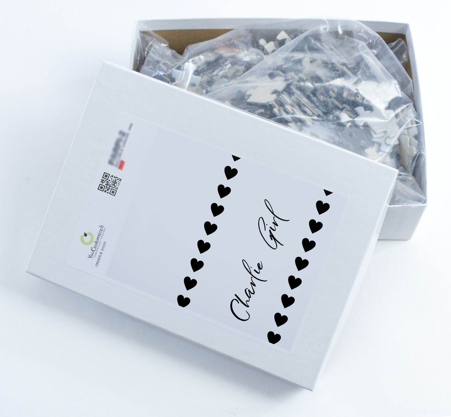 We print our puzzles on thick white chipboard in vibrant colors, then laminate the chipboard and die cut your puzzle. Your jigsaw puzzle is shipped to you in a box with the image of the puzzle on the box.