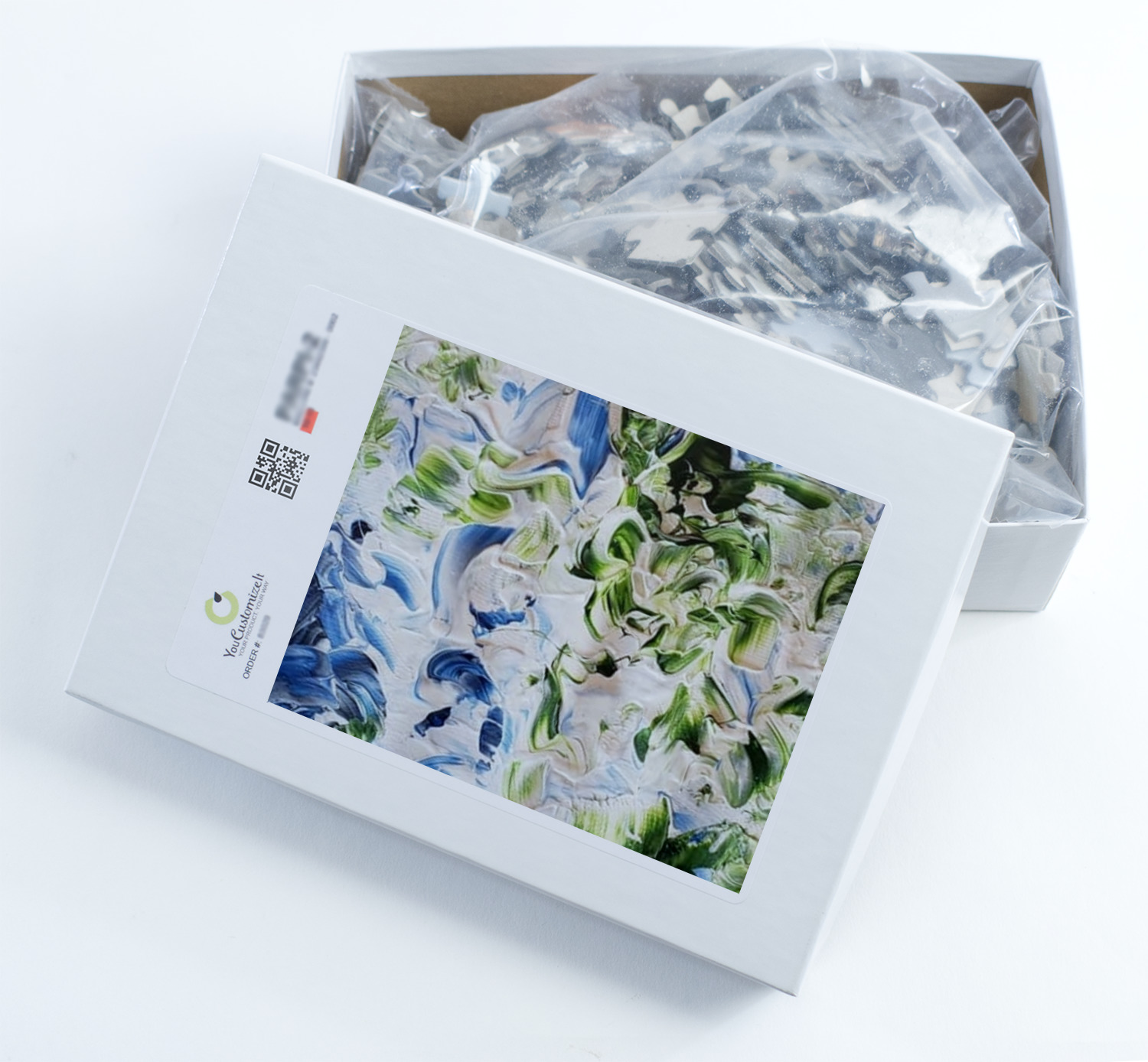 We print our puzzles on thick white chipboard in vibrant colors, then laminate the chipboard and die cut your puzzle. Your jigsaw puzzle is shipped to you in a box with the image of the puzzle on the box.