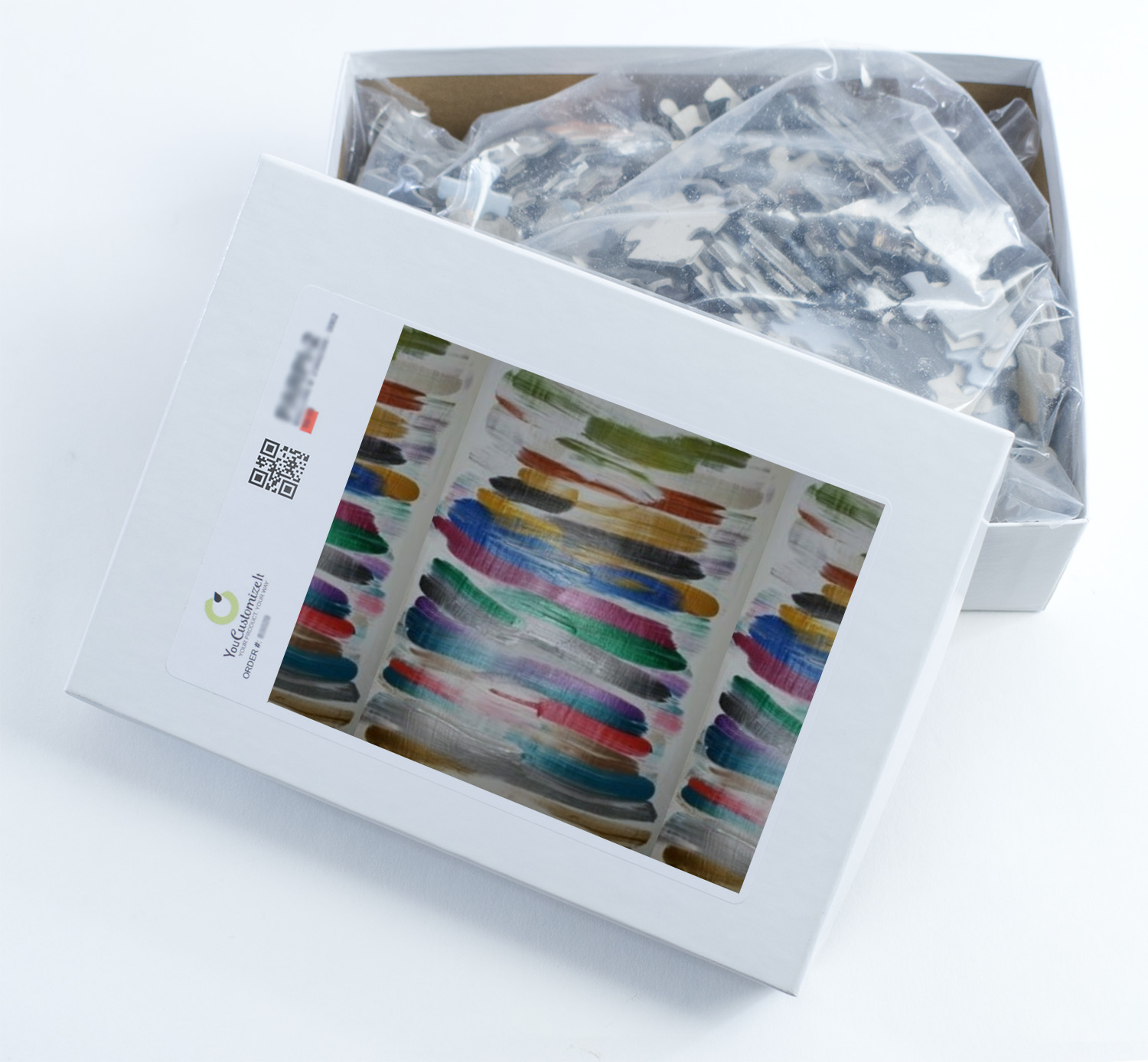 We print our puzzles on thick white chipboard in vibrant colors, then laminate the chipboard and die cut your puzzle. Your jigsaw puzzle is shipped to you in a box with the image of the puzzle on the box.