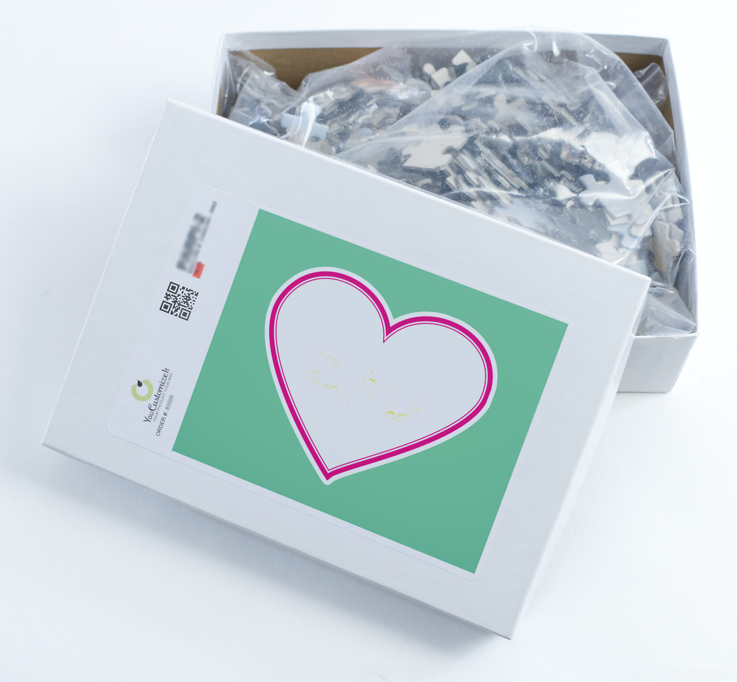 We print our puzzles on thick white chipboard in vibrant colors, then laminate the chipboard and die cut your puzzle. Your jigsaw puzzle is shipped to you in a box with the image of the puzzle on the box.