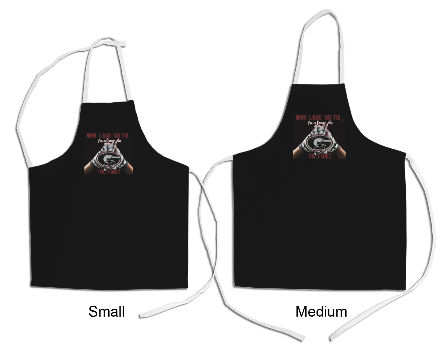 Our aprons are a lightweight yet durable polyester material. These aprons come in two sizes to fit most kids. We print your custom design on the front of the apron to display your creativity!