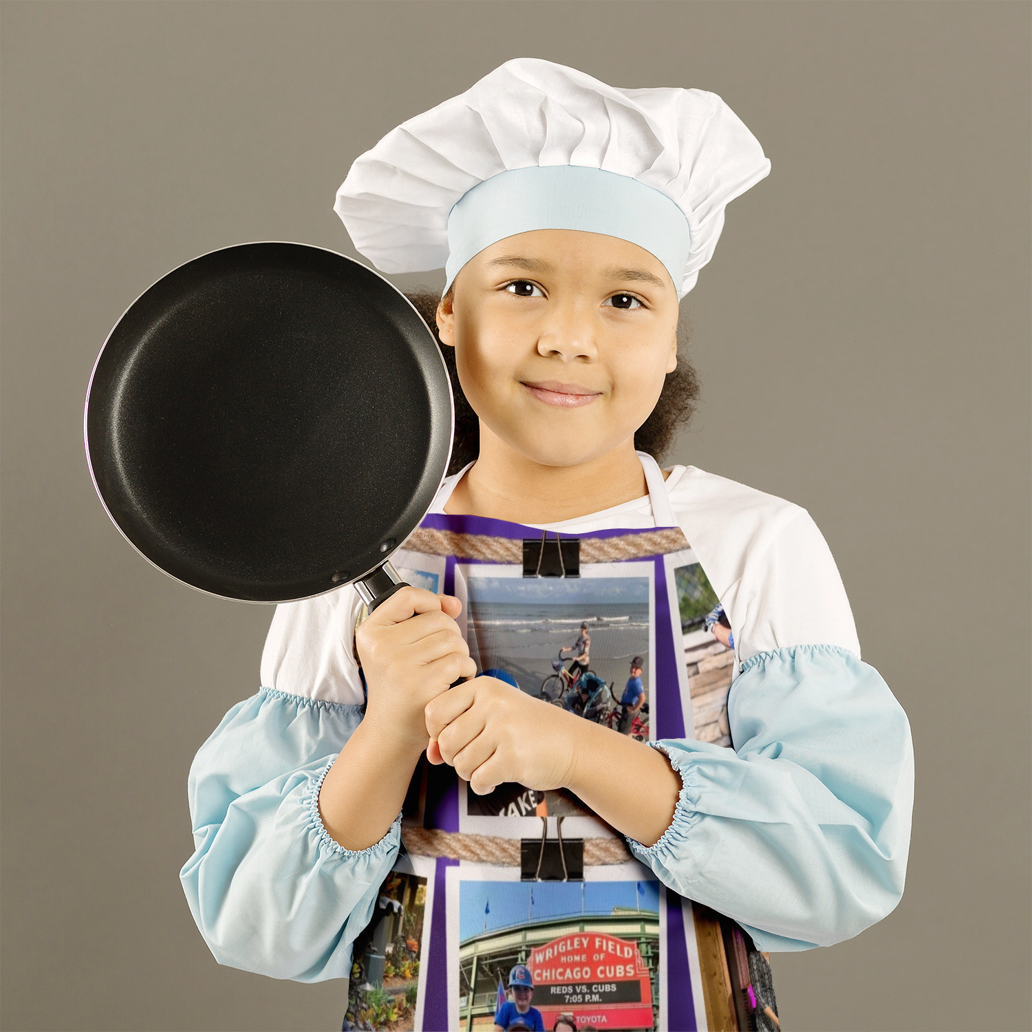 Our aprons are a lightweight yet durable polyester material. These aprons come in two sizes to fit most kids. We print your custom design on the front of the apron to display your creativity!