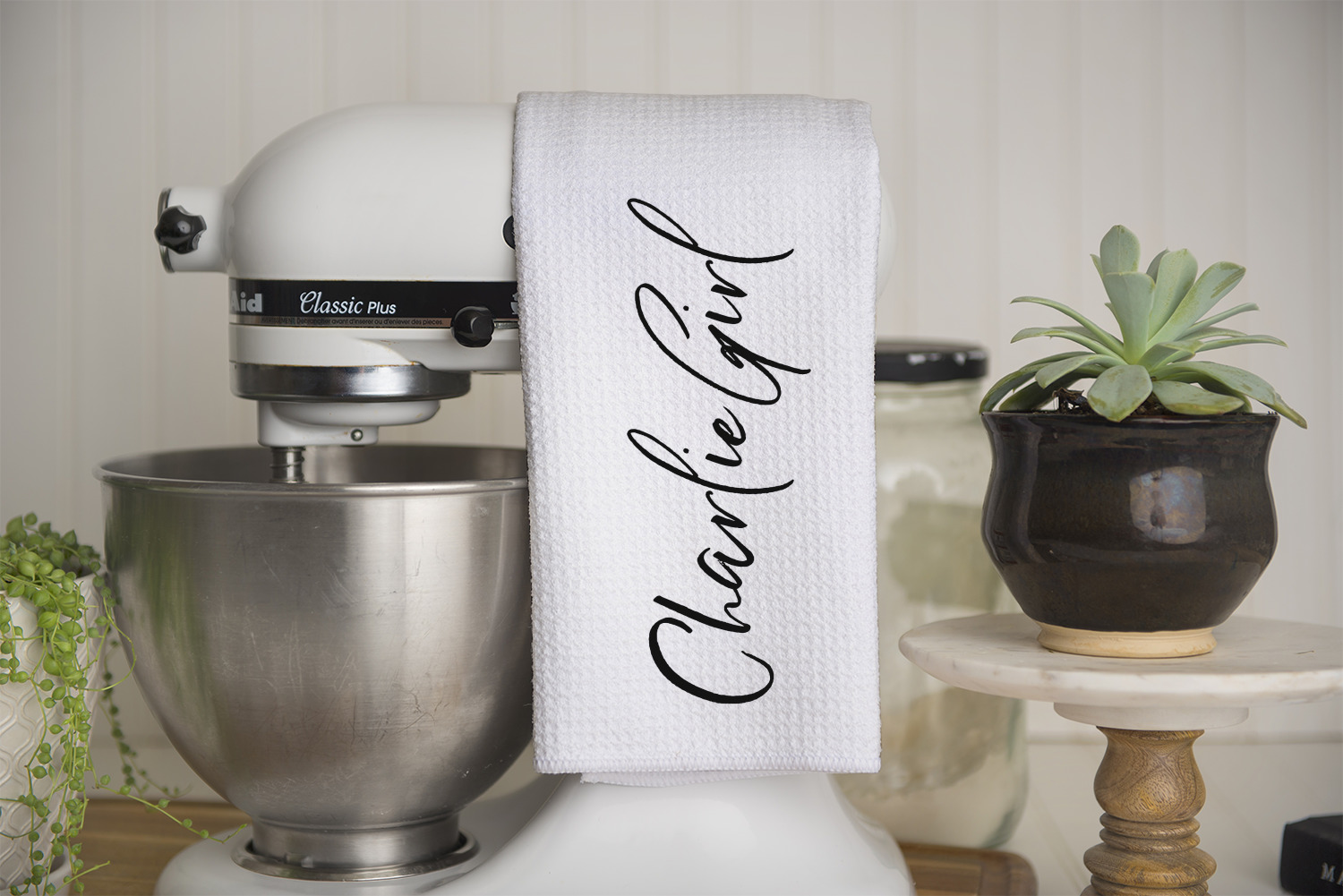 Each waffle weave kitchen towel is approximately 16 x 24 inches with your design printed on one side and the back is white.