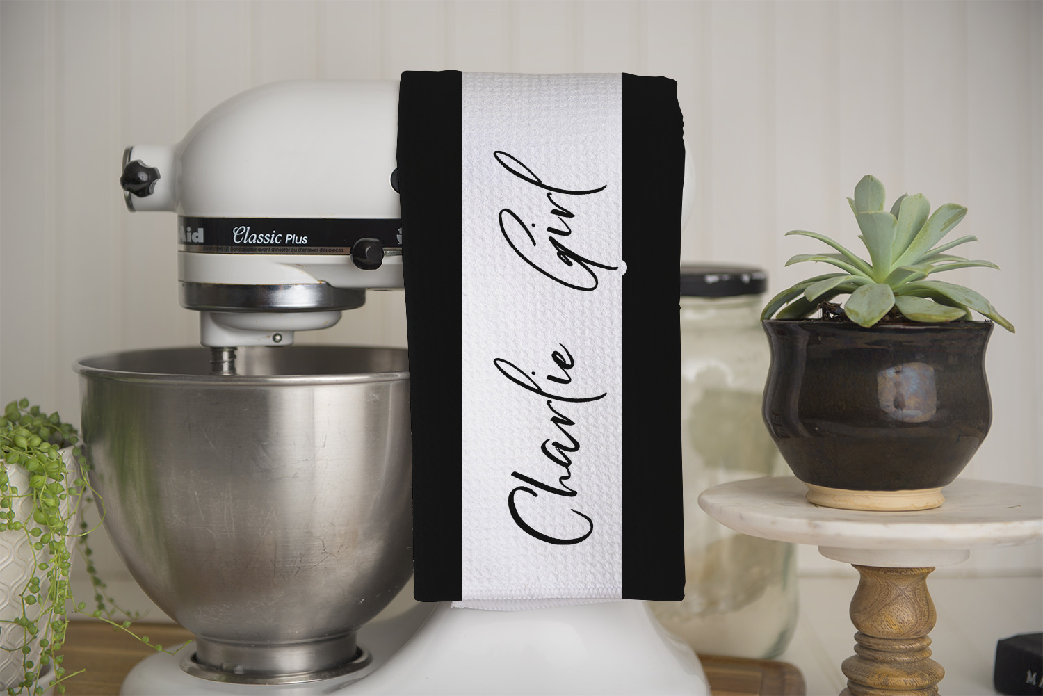 These towels have a fresh and modern look. They feel crisp, clean, light and airy - especially the partial print when customized with kitchen quotes & personalization in solid black color; thus giving the towels a classic black & white look!