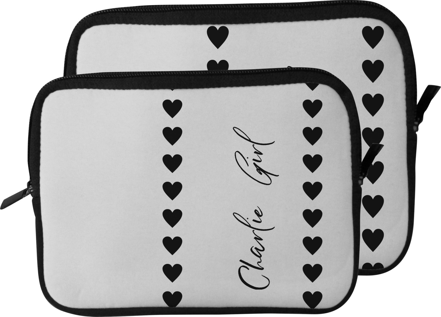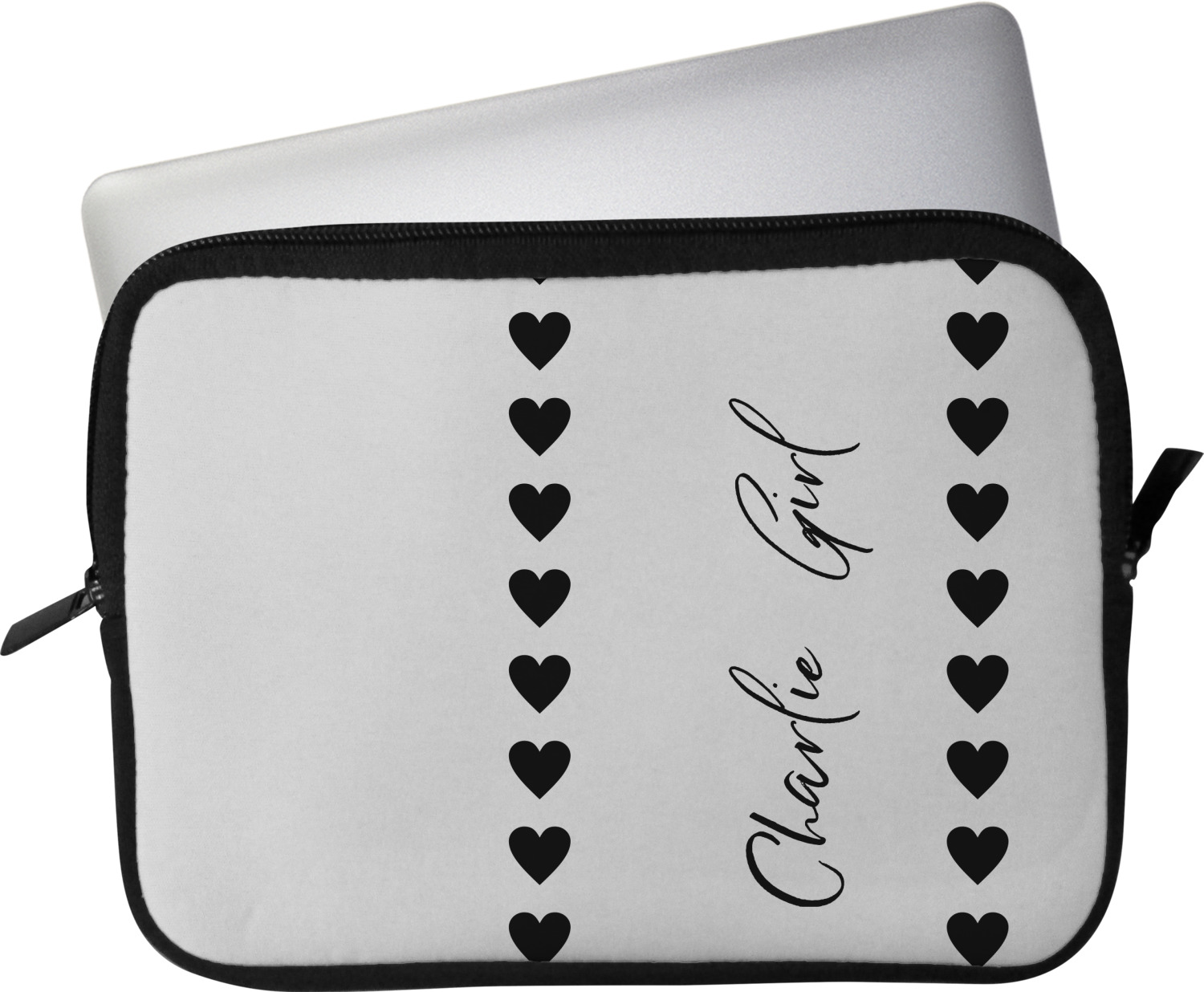 These laptop covers are built from a water-resistant, cushioned neoprene. We display your personalized design on the front of this computer sleeve, while the other sides are simply the black color of the neoprene fabric. A zipper lines the top half of this case, for direct access to your device. For added protection, the interior of this neoprene laptop sleeve is lined with a padded, minky-like material.