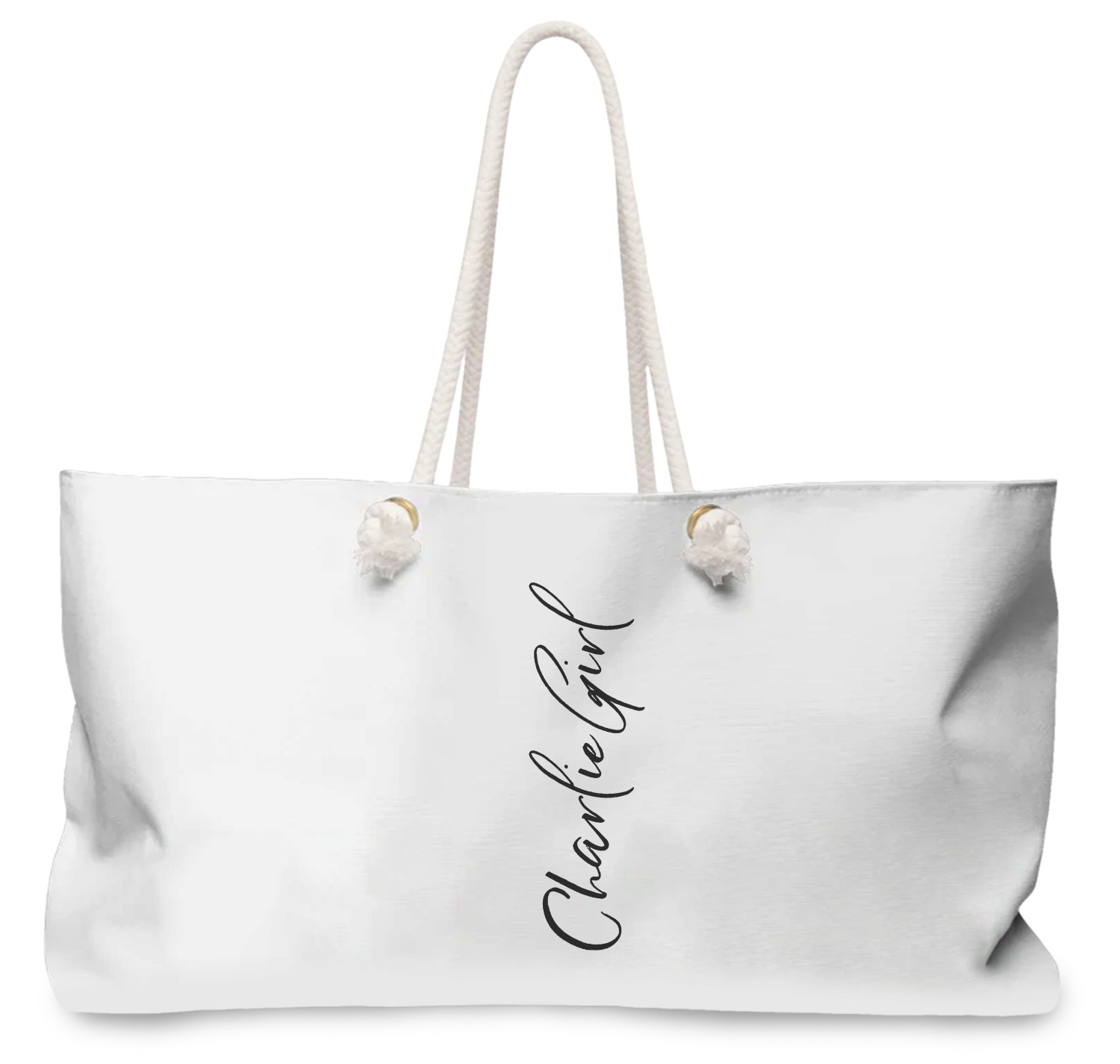 Our oversized weekender tote with rope handles is perfect for your weekend at the beach or on the town. This large tote are 24" W X 13" H, with a 5" gusset and a 27" thick rope handles with a knot that is put through a grommeted brass hole.