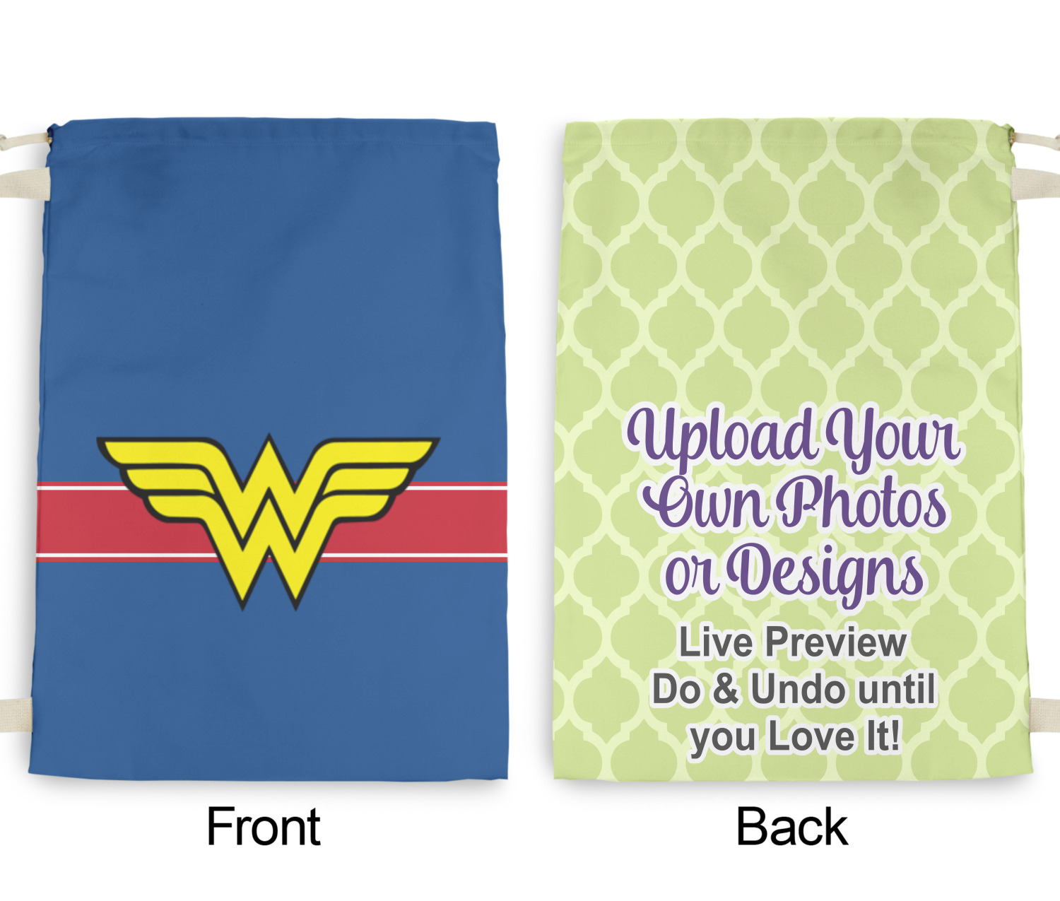 Carry your laundry in style with these customized laundry bags. Available in two sizes, featuring a natural colored woven strap and a cinch cord, these bags hold a lot of clothes or anything else you want to fit in them.
